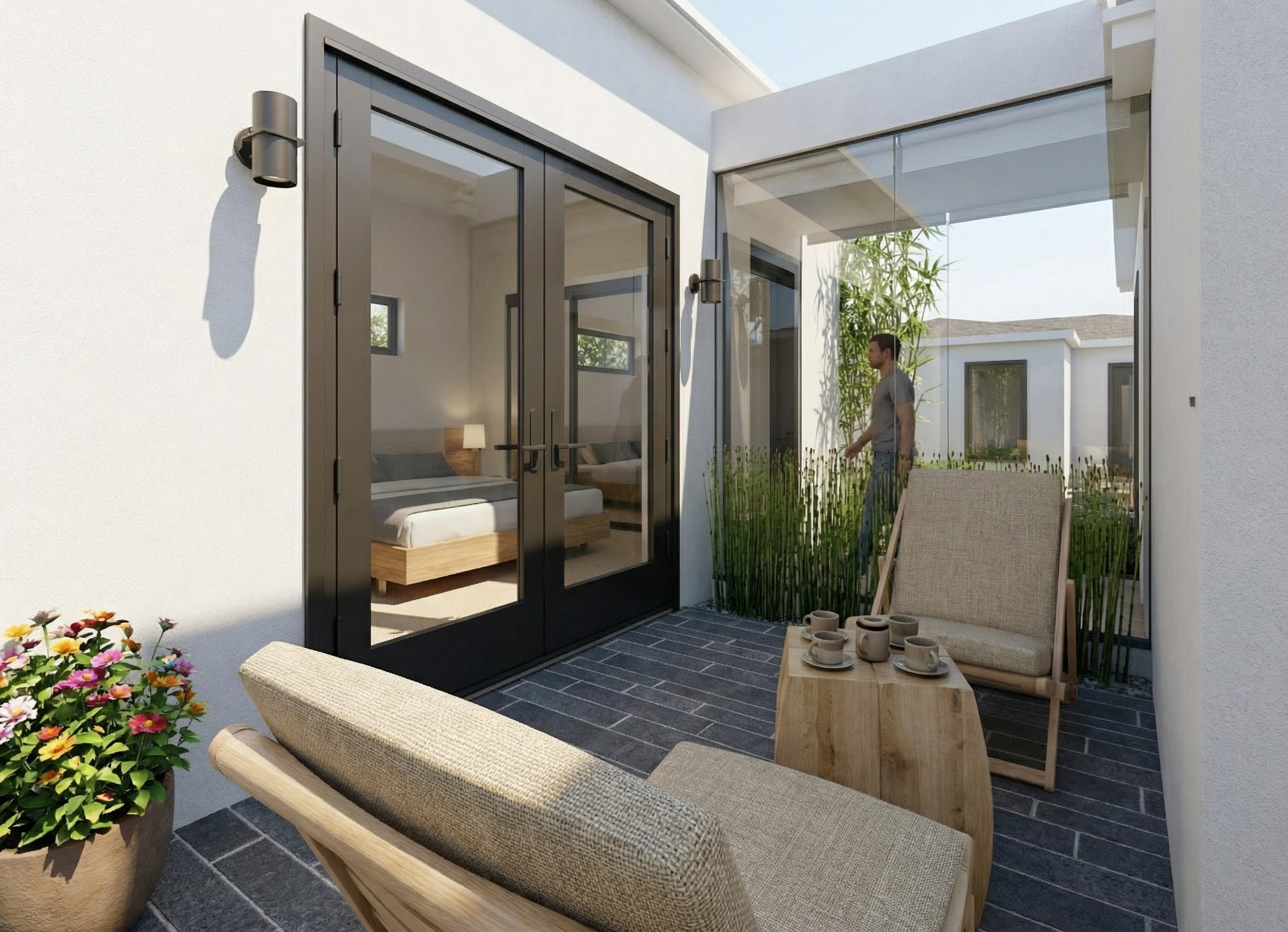 make this a night view with lighting in the corridor and outside keep the wood flooring material in the original view add a man sitting in the office chair at the desk inside the bedroom berber carpet in the bedroom