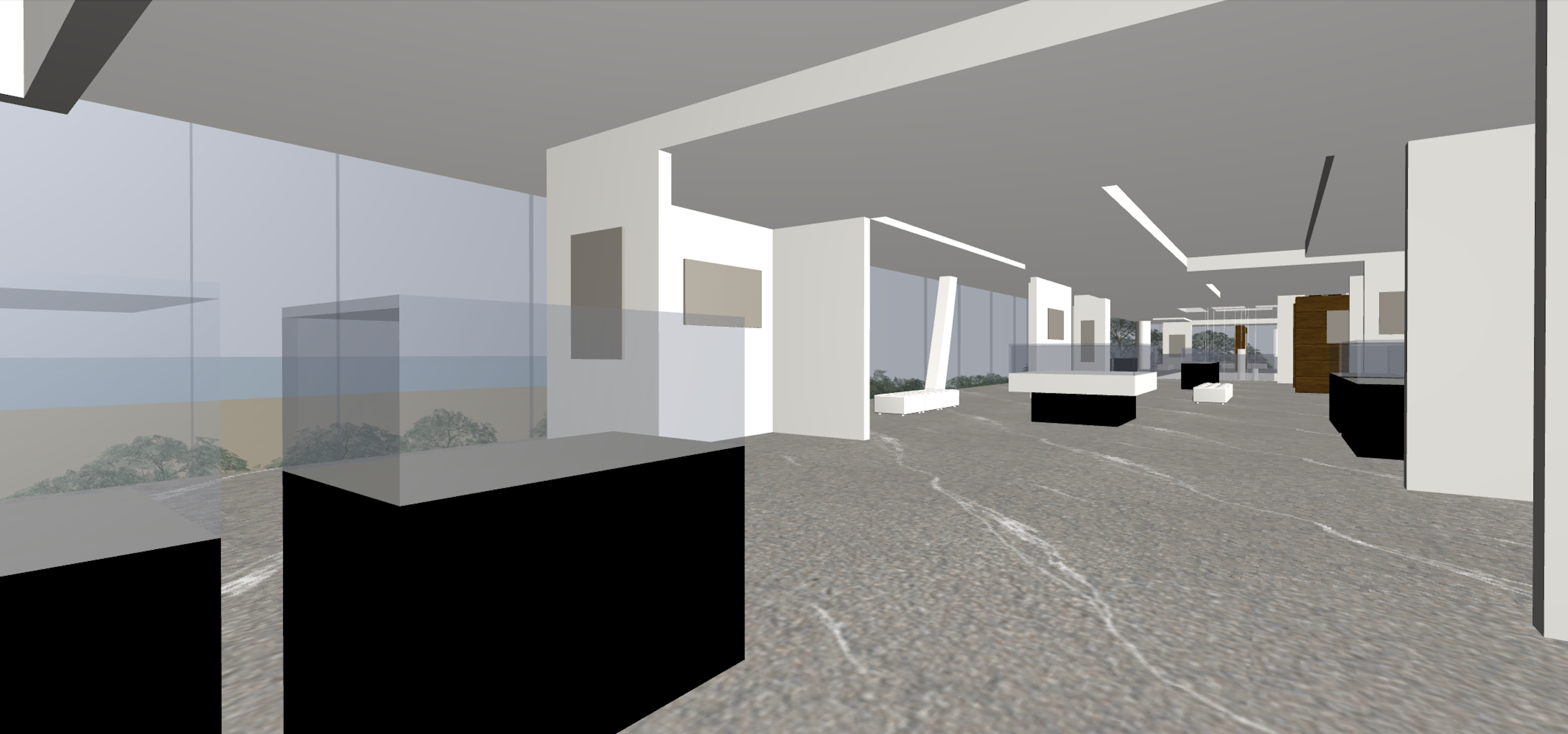 an exhibition of black and white photographs the display cases contain small white stone sculptures the sea can be seen from the windows