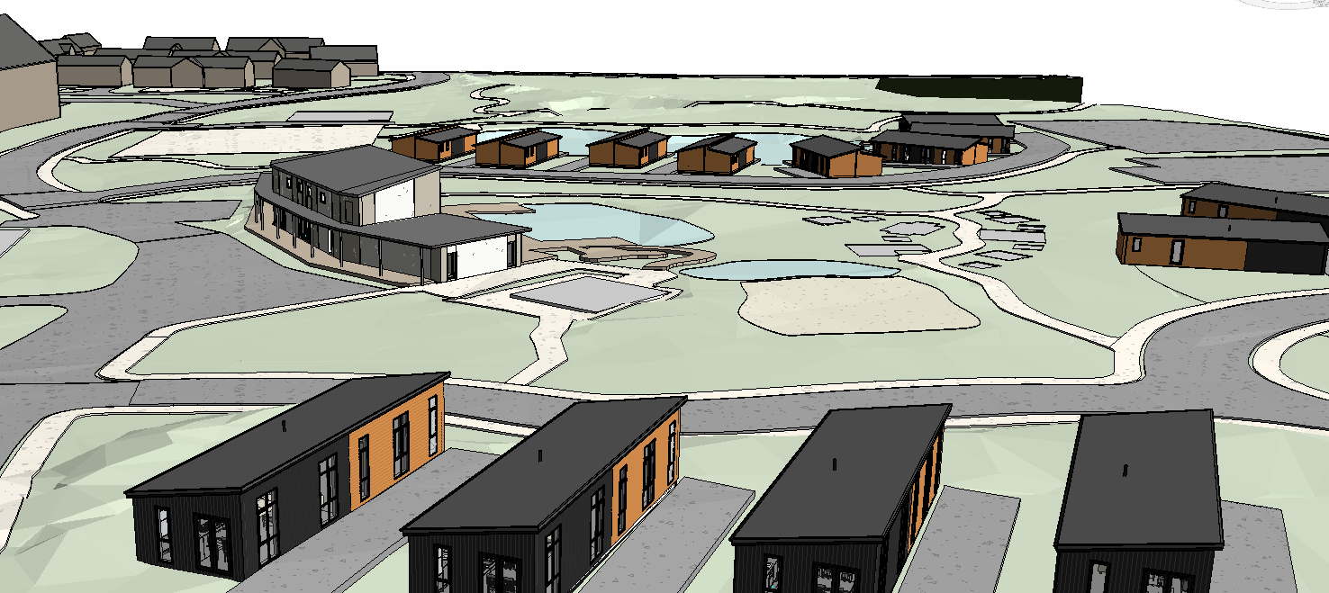 create a realistic architectural render of the image the image should depict a picturesque holiday park in the english countryside the park contains lodge style homes which are clad in a mixture of balck timber and natural light coloured timber they are modern in appearance and have large windows in the centre of the park is a curved leisure building which is clad in a natural light timber and a cream render to the front of the leisure building there is a small lake with a childrens play area to the left the image should be set in early spring and the glazing in the image should be reflective