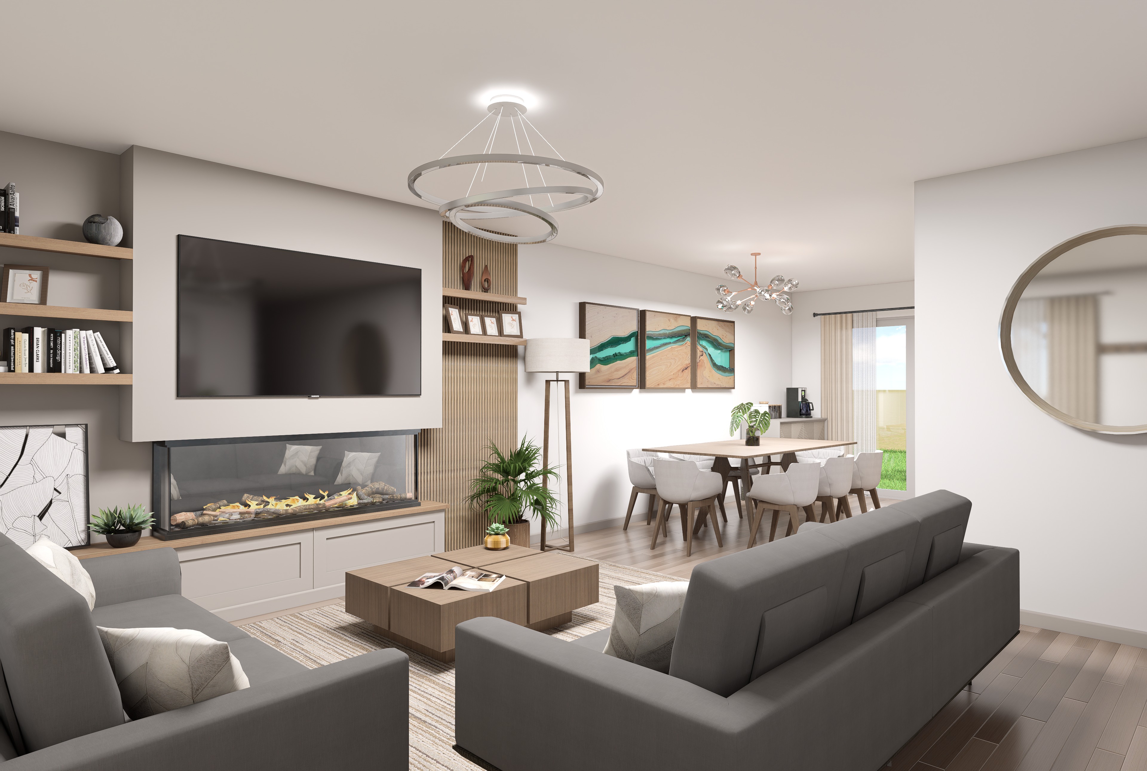 high end modern living and dining room interior photorealistic 8k render features a minimalist gray sofa a low wooden coffee table and an integrated glass fireplace under a large wall mounted tv background includes a dining area with white chairs and a wooden table lighting natural daylight from a large window combined with warm cinematic interior lighting highlights on the silver triple ring led chandelier and wooden slat wall panels materials polished wood soft gray fabric glass and brushed metal sharp focus clean lines architectural visualization style