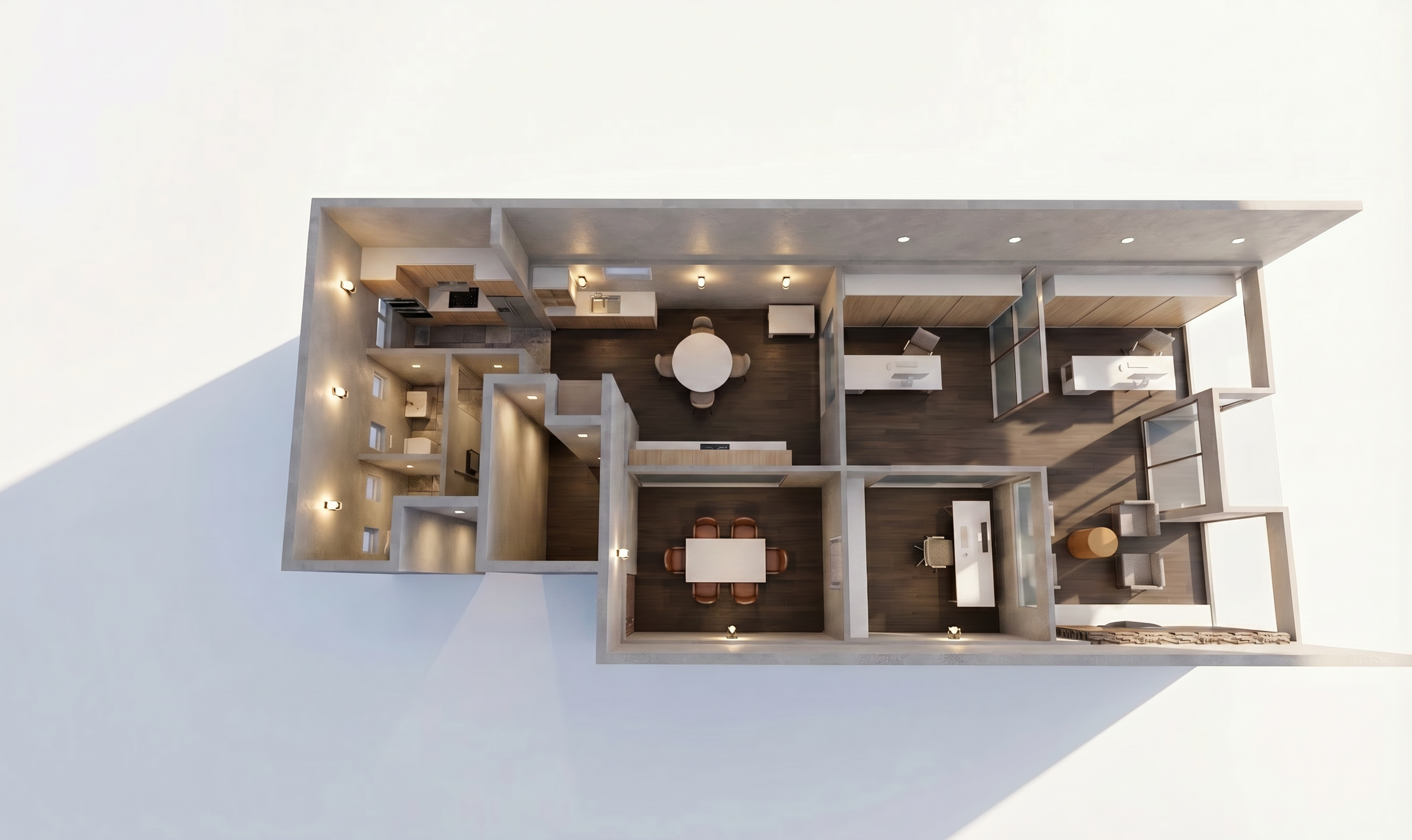 add kitchen cabinetry to the kitchen area and under the kitchen window there is a sink make all the table and desk tops white