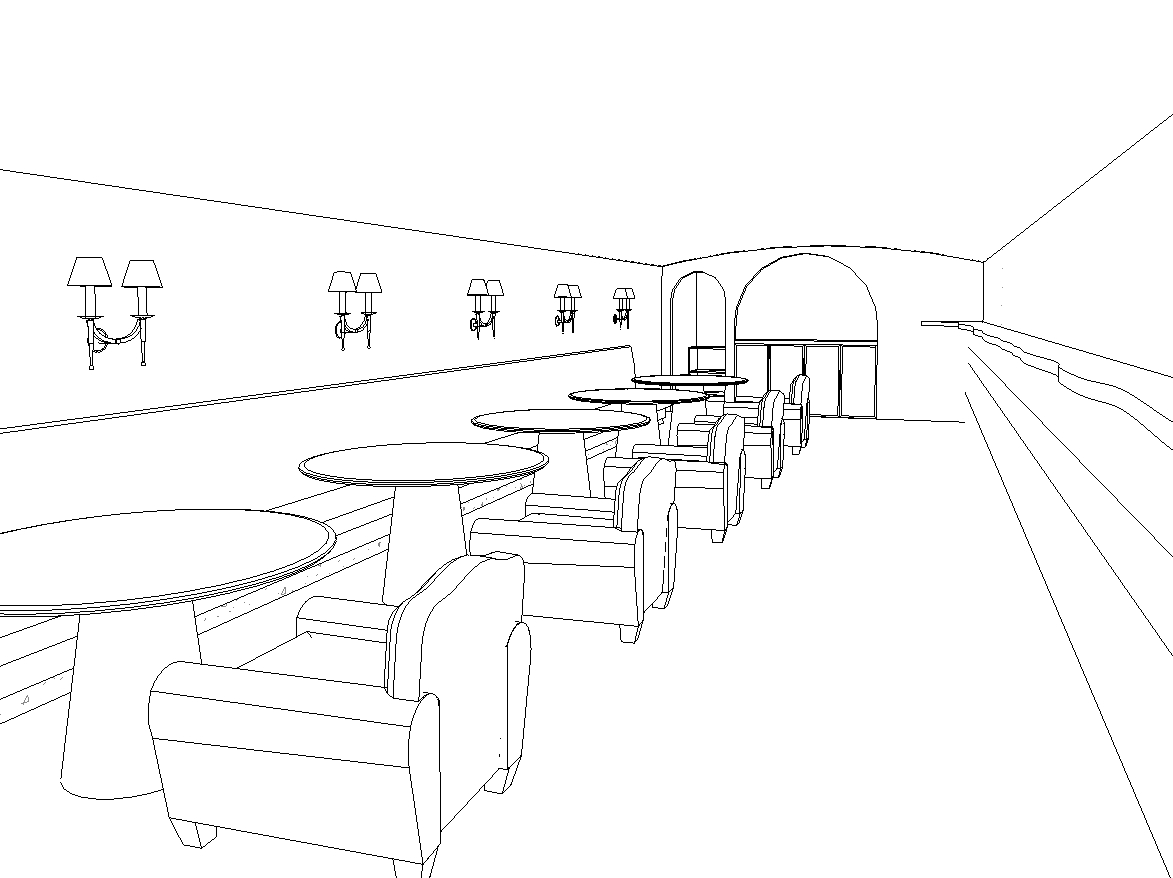 gothic interior shot the shelf on the right will be stone with a stone wall below it the chairs and bench are tufted leather and the paneling at the bar is wood the ceiling will be a coffered copper panel with motifs the floor will be a dark hardwood the walls will be a formal wallpaper don t remove the bar in the back or the arched openings architecture