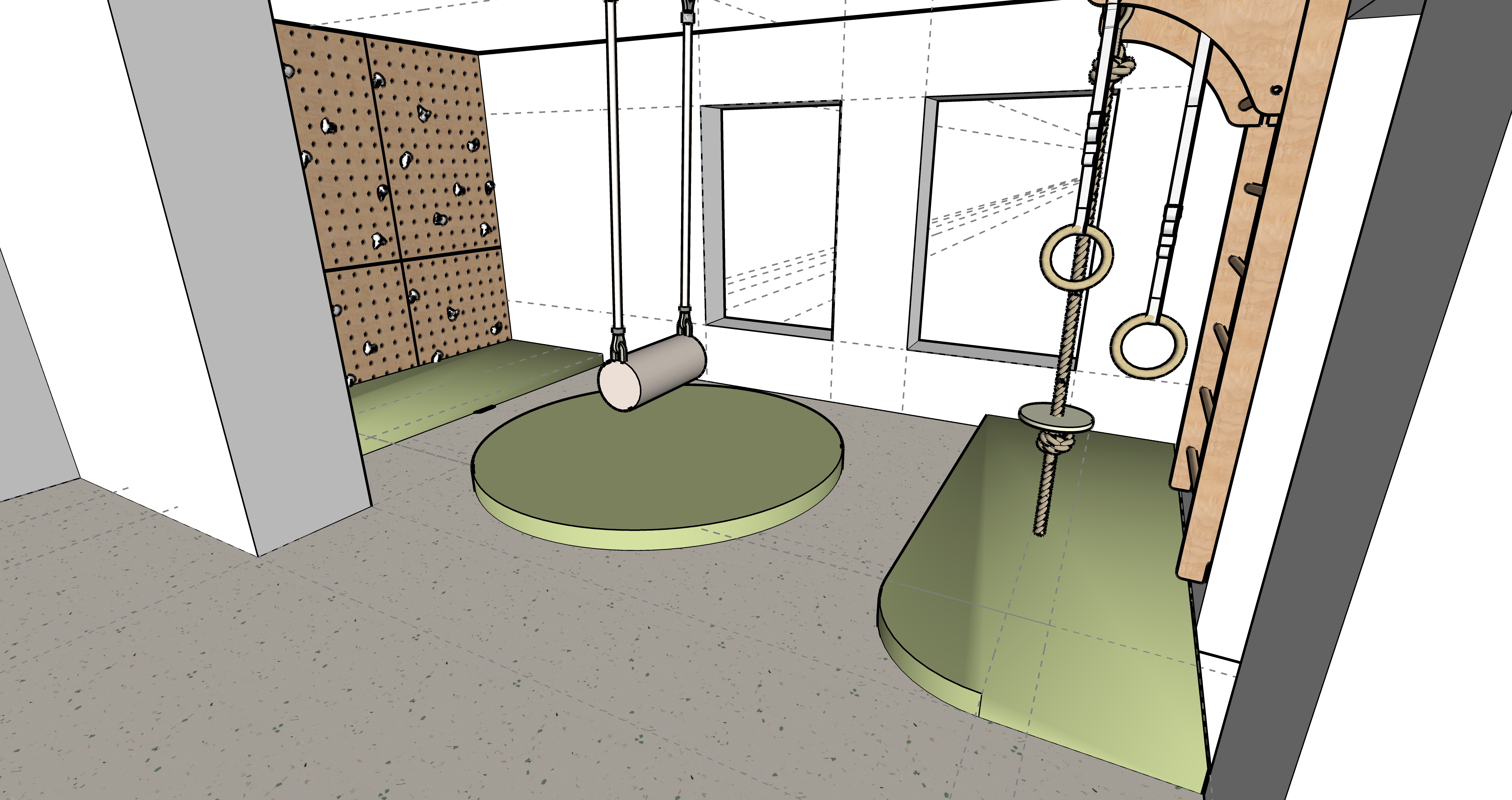 make it as real photo put windows put safety nets on the windows on the back wall there is a climbing wall wal have small holes to insert a fake rocks it is made from plywood floors are terrazzo linoleum put fake white rocks on the climbing wall put a swing above round mattress swing shape the same as my primary picture shows mattress should look soft as they shoud be
