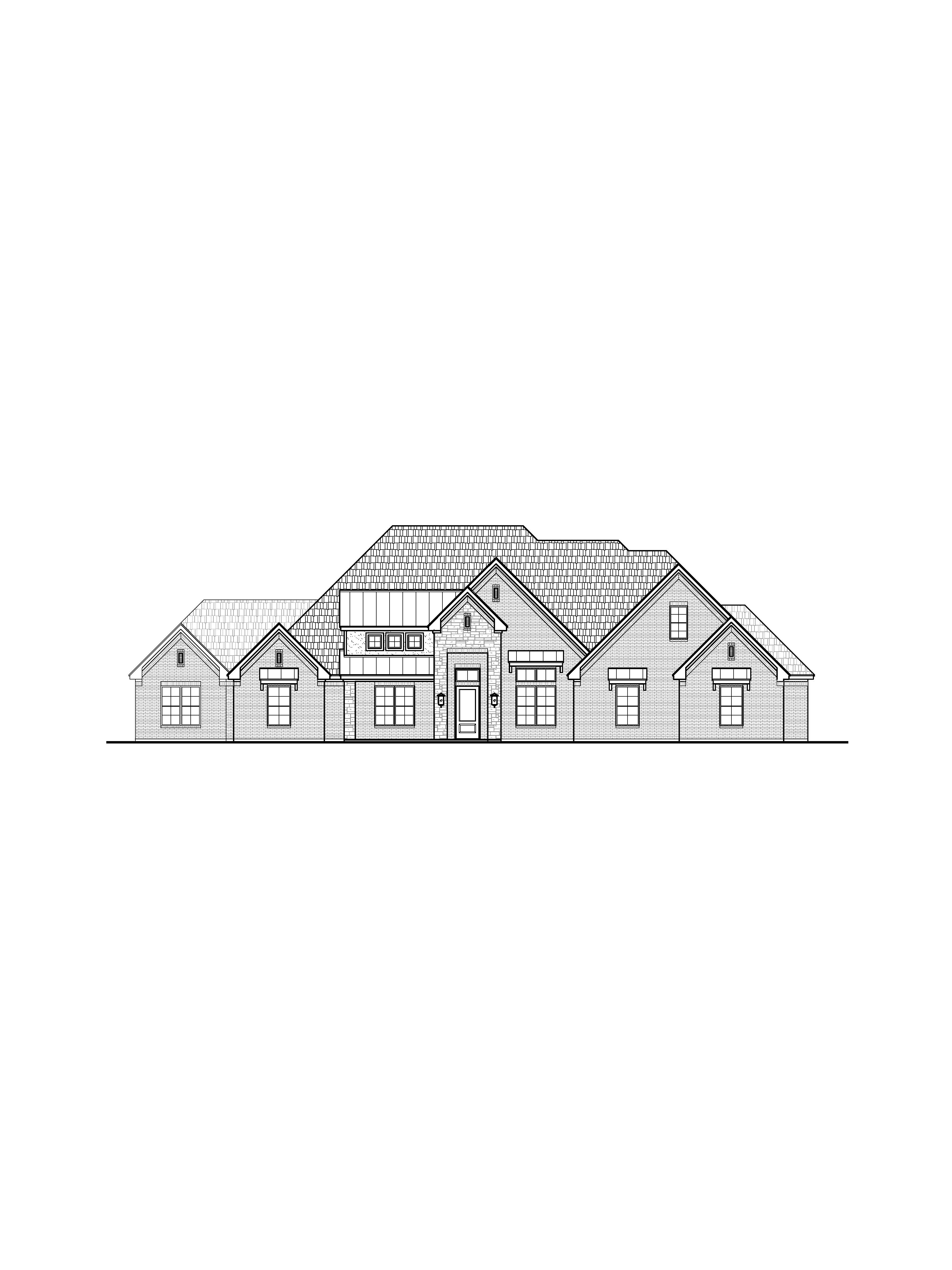 full view of the house black roof black trim white stucco white brick light limestone black metal roof accents lush landscaping with curved sidewalk curved driveway to the right side big trees at the back