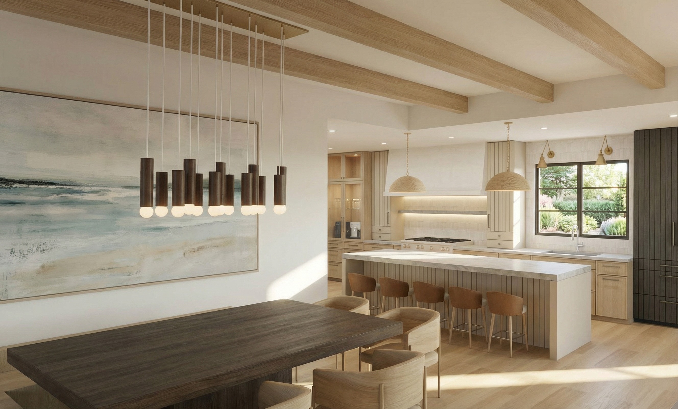 recreate this photo realistic rendering keep all lighting finishes adn details as is change beams and dining table for medium brown rustic finish keep dark grey stained oak tall cabinet on far right keep island painted off white to match upper right and left cabinets of range