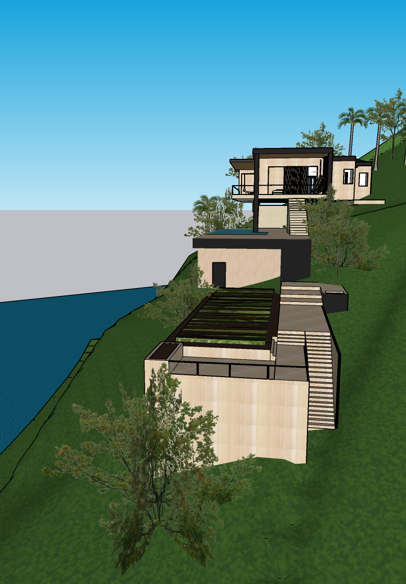 exterior shot a modern hillside villa overlooking the ocean set against a clear blue sky the structure features sleek beige concrete walls with dark gray accents creating a contrast with the lush green grass and trees surrounding the property in the foreground an infinity pool shimmers with deep azure water reflecting the serene atmosphere palm trees sway gently at the top of the hill adding to the tranquil and luxurious ambiance the overall scene is vibrant yet peaceful capturing the essence of modern architectural beauty in a natural setting