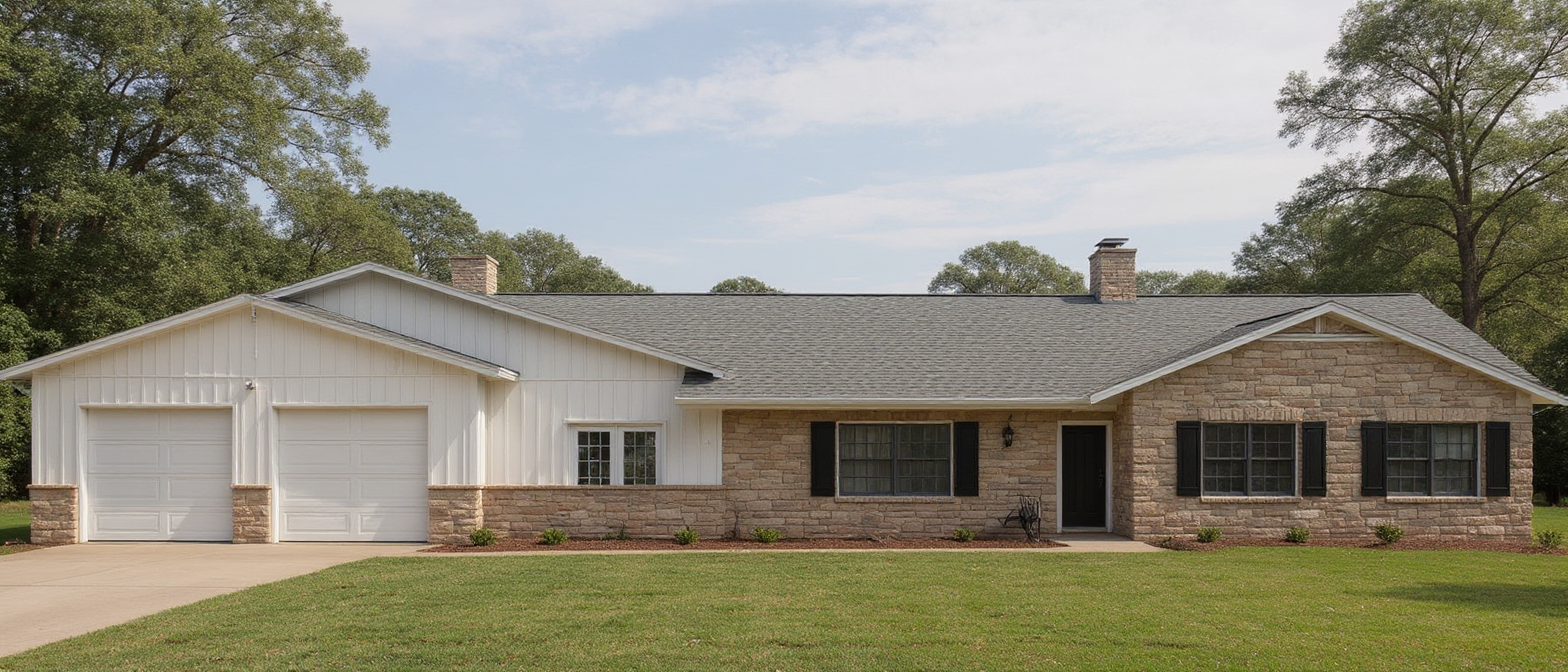 the body of this house will be white board batten style siding installed vertically and from the top of the 40 high kusman stone wainscot arounf the base of the house the roof shingle will be a medium gray asphalt shingle the chimney adjacent to the garage will also have the existing kusman stone on it the white single hung windows will have black shutters on each side use black for the roof fascia the two openings on the left are section garage doors