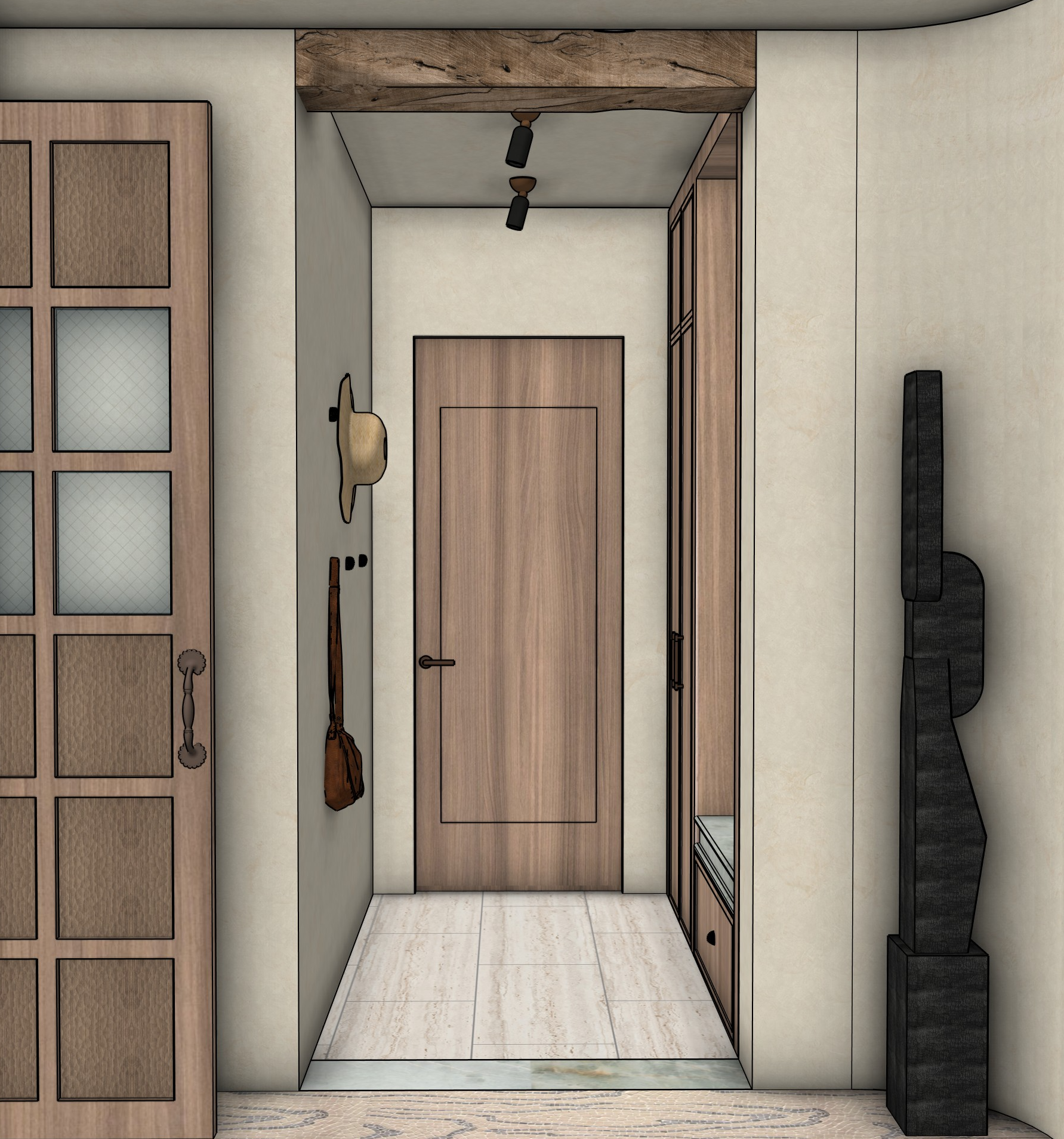ceiling light is a asian style fabric with tassle timber is a warm muted mid tone not light not dark walls are a warm offwhite limewash