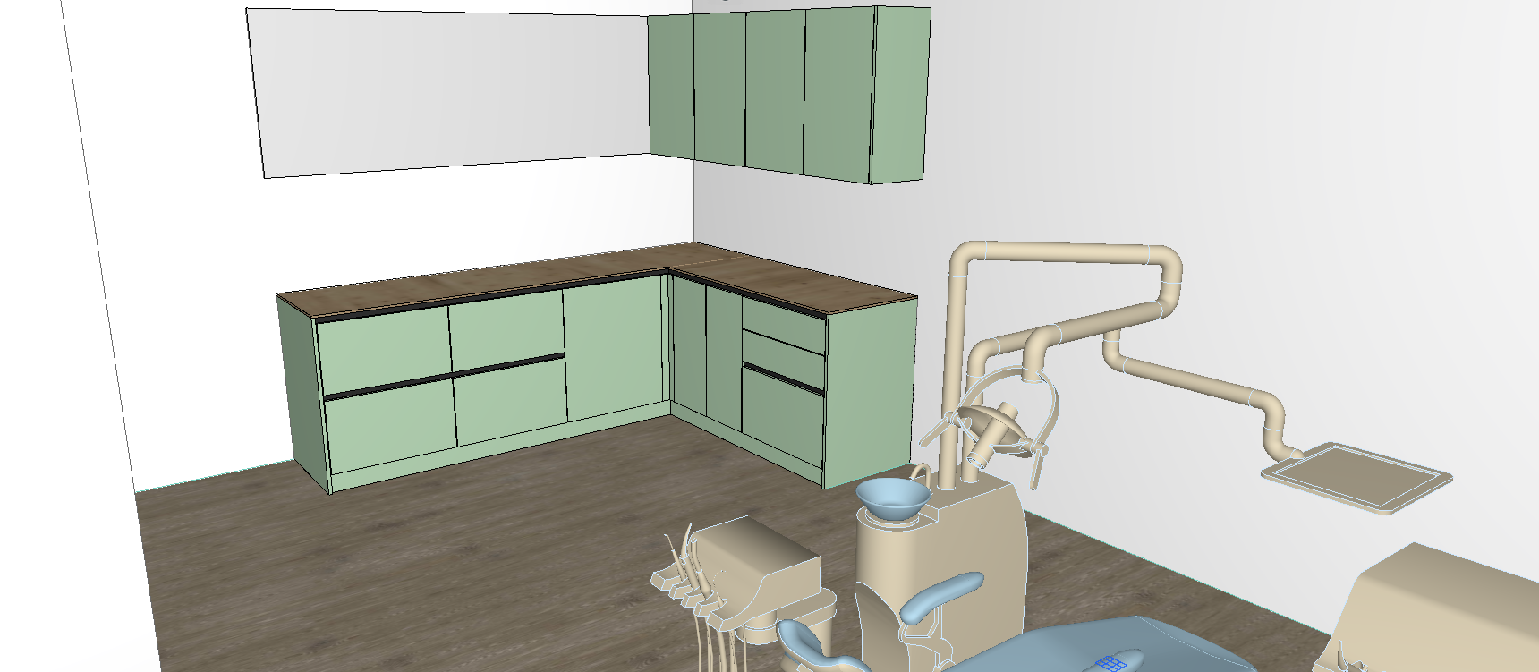 highly realistic modern kitchen render preserve the exact original archicad model dimensions proportions cabinet layout and all existing details without changing or adding anything the kitchen cabinets should remain a soft light olive green color with a smooth matte finish the worktop should remain natural light wood with realistic wood grain subtle texture and authentic material variation keep all edges handles joints corners and surfaces exactly as designed in the original model use realistic daylight coming from the windows soft shadows accurate reflections and natural ambient lighting make the materials look highly realistic especially the matte olive cabinet fronts the wooden worktop and any metal or glass details the render should look like a real photographed kitchen interior with premium textures balanced lighting and realistic depth without changing the design colors or adding extra decorative elements