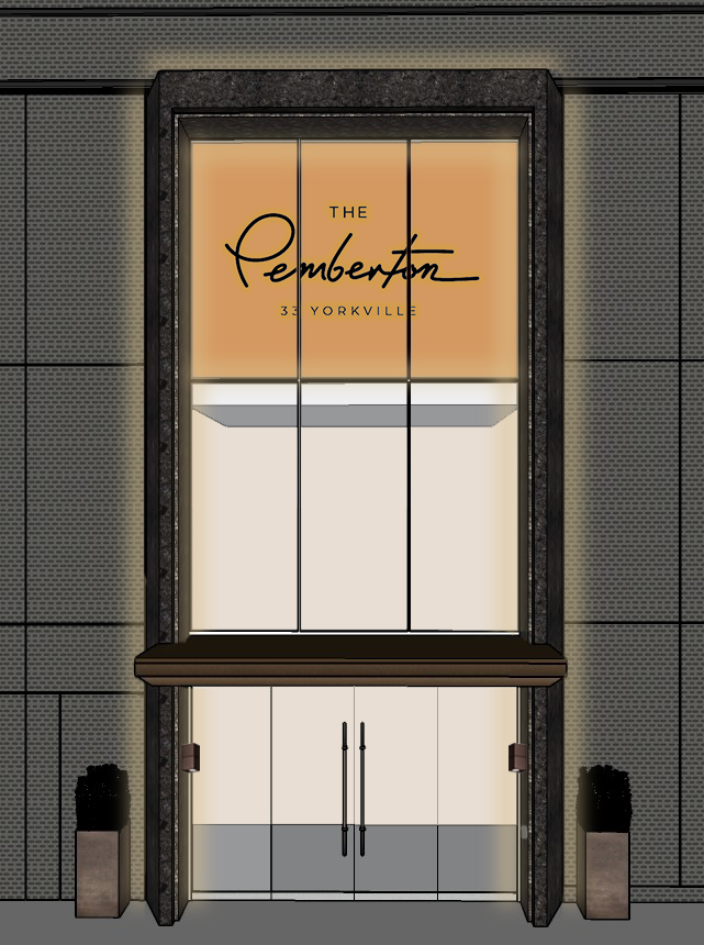 create a photorealistic architectural rendering using the provided sketchup model as the base geometry maintain the exact proportions layout and architectural elements of the model this is the main entrance of a luxury condominium building with a prominent canopy architecture maintain the existing proportions and architectural elements from the model a rectangular canopy projecting above the entrance a glass curtain wall above the canopy revealing the slab of the upper floor behind the curtain wall there is a feature wall in a warm orange brown tone with the building logo centered and softly backlit with led lighting the main entrance doors below the canopy should be glass with elegant metal framing respecting the reference proportions and openings and color the two middle doors must be automatic sliding glass doors handles should respect the reference design materiality and style adjust the palette to a cooler and more contemporary silver toned aesthetic facade cladding in graphite gray perforated panels with alternated holes the panels should respect its subtle joints canopy structure finished in champagne bronze window and curtain wall frames in white aluminum glass should look clear and reflective with subtle reflections of the city feature wall above should remain painted in a warm terracotta burnt orange color to create contrast with the cooler exterior tones lighting very important warm architectural lighting 3000k integrated above the canopy washing the upper wall and curtain wall additional lighting as the reference image on the exterior side of the frame and surrounding the curtain wall soft led backlighting behind the logo on the orange brown feature wall wall sconces on the sides of the entrance similar to the reference image but slightly smaller in scale mounted a bit higher on the wall visually balanced with the door height and canopy atmosphere and realism evening or dusk setting to emphasize lighting cinematic lighting and reflections on glass and metal highly realistic materials global illumination and soft shadows luxury residential aesthetic similar to a yorkville condominium entrance clean urban sidewalk in front of the entrance camera eye level frontal perspective centered on the entrance slightly wide architectural lens 24 35mm symmetrical composition emphasizing the canopy and illuminated logo wall important instruction enhance realism while strictly preserving the geometry of the uploaded sketchup model