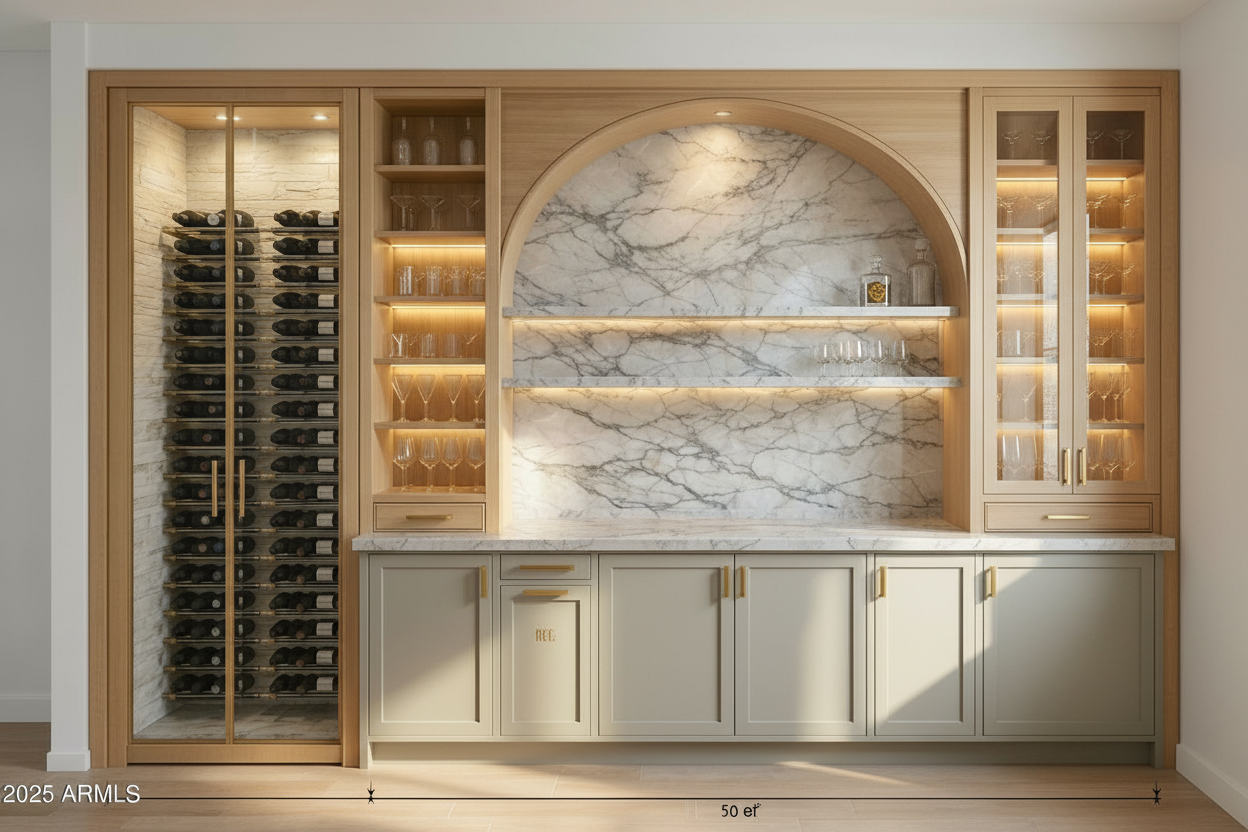 there are glass cabinets that sit on top of the countertop here they need to be identical in size and design the left not the wine area cabinet next to the arch is what the right one should look like