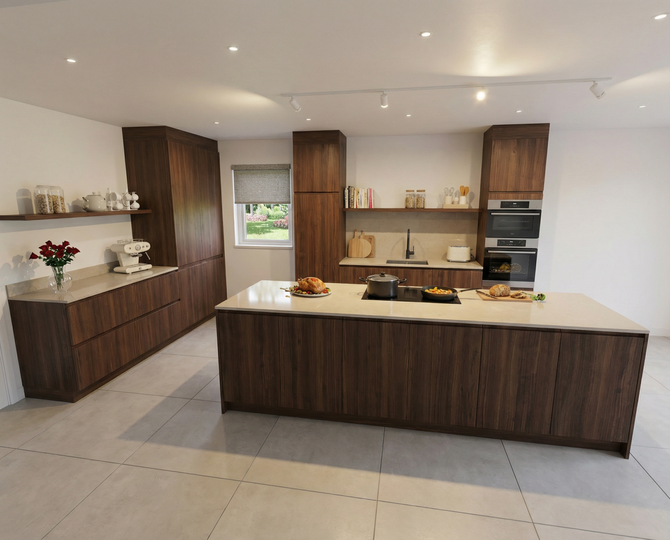 render the existing restaurant interior as a dark premium fine dining space inside a contemporary glasshouse preserve all existing geometry exactly use a low luminance palette of oxblood wine red dark terracotta burnt umber and deep walnut woods cream and stone tones are minimal and dark toned used only to highlight form create a curved monolithic bar in matte darkened stone or tinted plaster behind it apply full height vertically segmented deep wood panels with subtle warm backlit shelving sparse and controlled walls combine dark warm plaster microcement with integrated vertical wooden accents and ribbed wood panels matte and tactile revealed by soft concealed grazing light enhance the ceiling with a suspended flowing perforated metal mesh installation in deep red oxidized copper tones softly and unevenly illuminated no visible spotlights add high end fine dining furniture dark wood tables upholstered chairs in oxblood or deep neutrals curved banquettes and elegant upholstered bar stools layout is spacious and curated lighting is low warm and cinematic with deep shadows and controlled reflections style is modern luxury hospitality intimate and restrained ultra realistic architectural render high material fidelity avoid bright whites cool tones glossy finishes industrial or casual elements over lighting