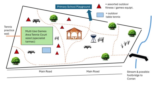 create a community recreation area featuring 1 installation of a range of open air calisthenetic equipment and a small bouldering wall for older children and adults 2 installation of select pieces of outdoor play equipment providing physical activities for 2 6 year old children 3 create a community garden and accessible scenic paths through the landscaped area 4 install fixed bbq areas and benches for public picnics and a timber gazebo for shelter small outdoor classroom 5 selective planting of flowering shrubs and creation of wildlife friendly habitats will increase biodiversity and provide outdoor learning opportunities