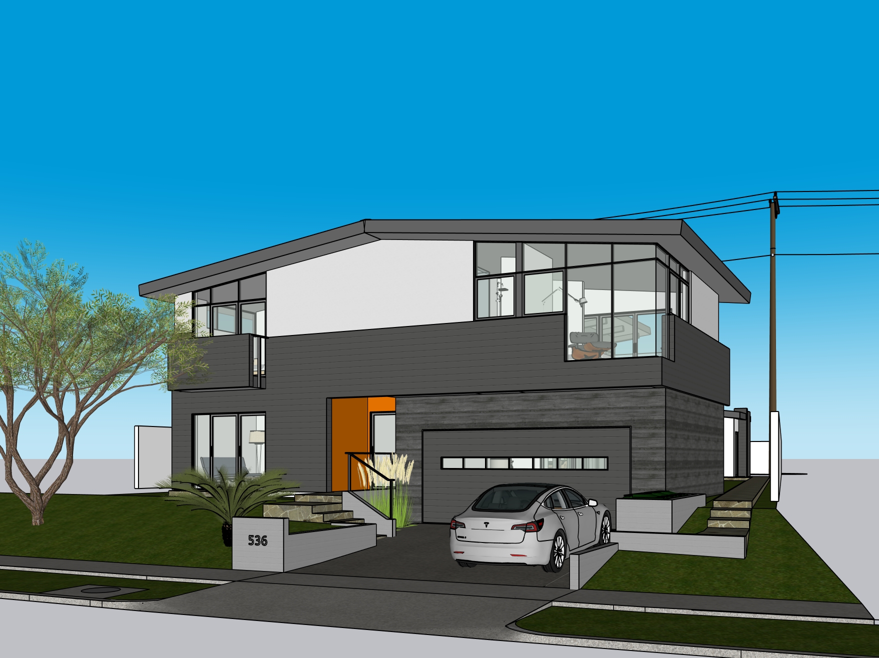 evening view lights on inside the house add california wild grasses and flowers to the landscape add grass in the the yard space enhance the glazing materials add some palms and trees adjacent to the house on the left and right sides of the view add some lights in the planting areas use the perspective view from the source image add a woman walking a golden doodle on the sidewalk add a man and girl waling towards the front entry door don t change the camera angle of the source image