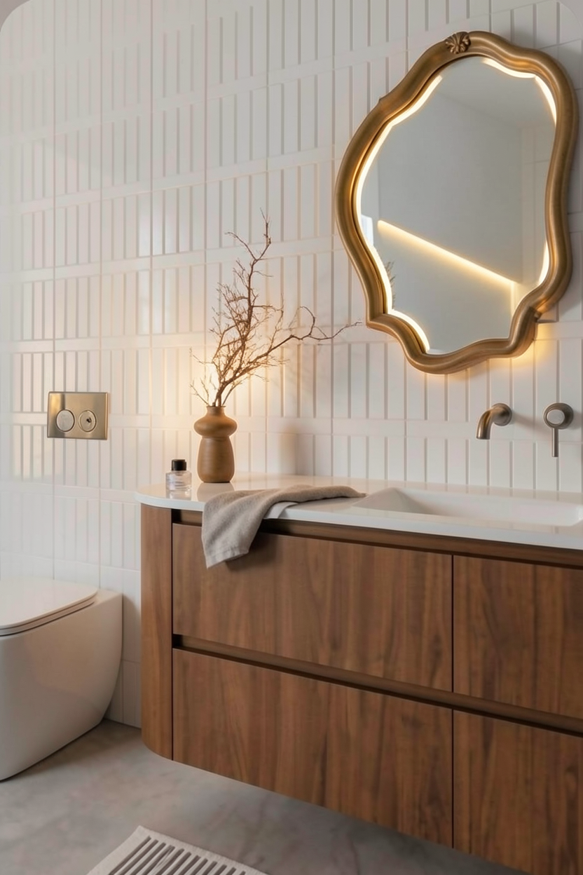 change the mirror shape to a free form elegant shape and make it look like it has a hidden lighitng behind don t change anyhting else i don t wanto to have a frame clena and minimal