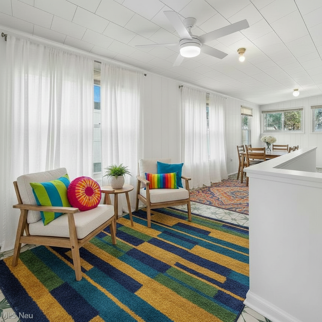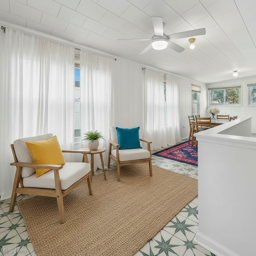 remove the small light bulb fixtures on the ceiling insert 1 hanging plant in front of each window
