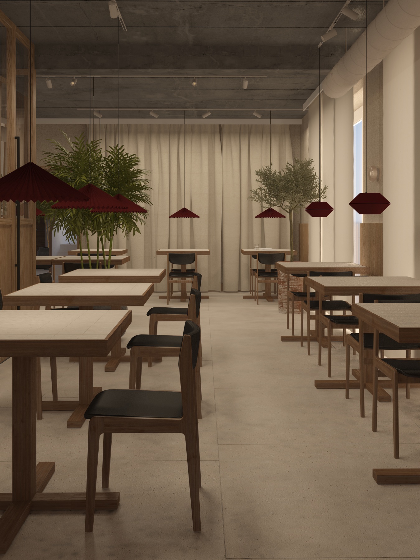 enhance the realism of this architectural visualization without changing any materials colors textures finishes furniture layout proportions or design elements keep all existing materials and color tones exactly as they are improve photorealism by refining natural lighting global illumination soft shadows subtle reflections accurate light bounce and realistic exposure add physically accurate light behavior micro contrast depth and subtle imperfections very delicate surface irregularities fine texture detail while preserving the original look improve realism through physically correct daylight simulation soft contact shadows realistic ambient occlusion subtle material roughness refinement without altering material type or color enhanced depth of field very subtle natural cinematic but natural color grading no color shift high dynamic range lighting do not redesign restyle recolor replace materials or modify objects maintain the exact same design only increase realism and photographic quality output should look like a professional architectural photograph ultra realistic natural balanced high end visualization scene is iluminated by artificial light behinde curtain in the front there is a wall there is no window behind the curtain do not change texture of the floor tabletop is made from small 10x10 cm tile