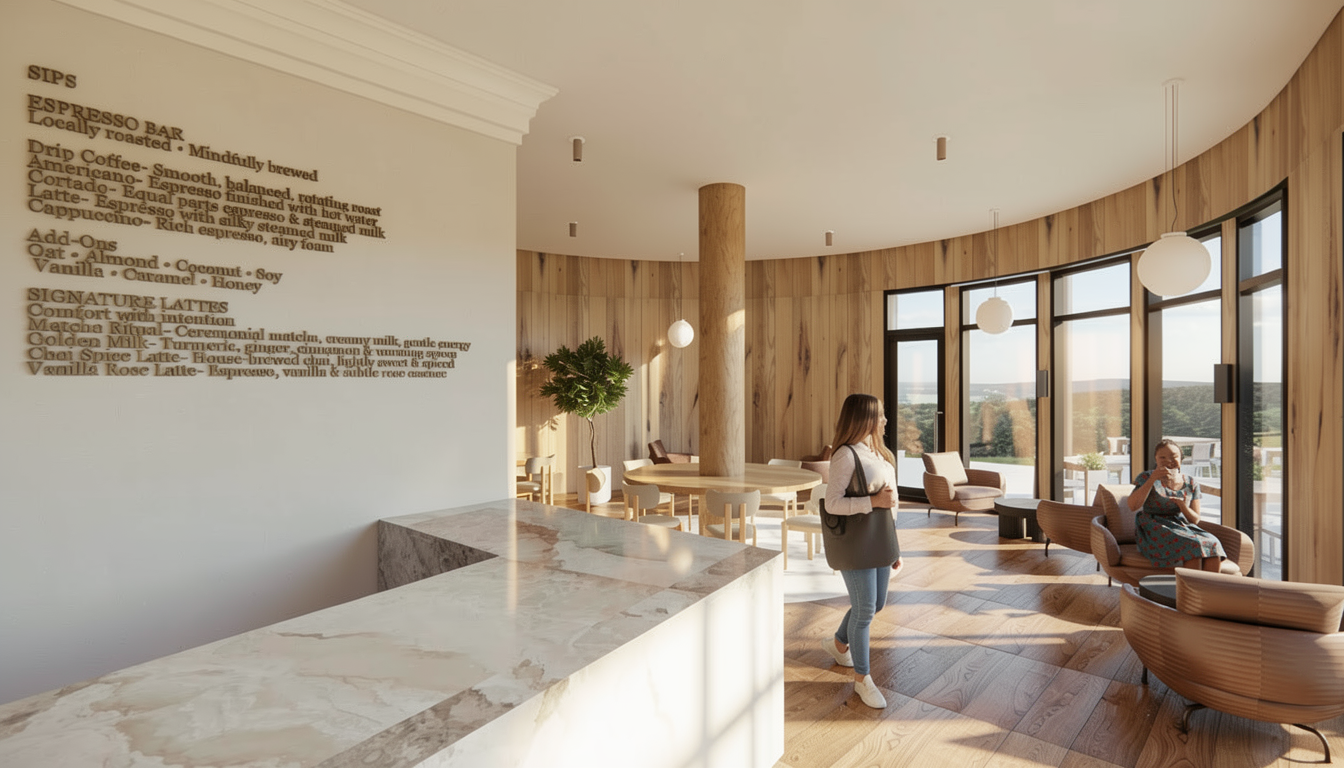 transform the provided image into a high end photorealistic render while keeping everything exactly the same same proportions same shape same materials the fabric is from camira the replay flex rep01 please take it in the right proportions the side tables are all white and the tabletop have a multiplex edge the table s base is white the round stool and the rectangular stool should have the same texture as the other stools