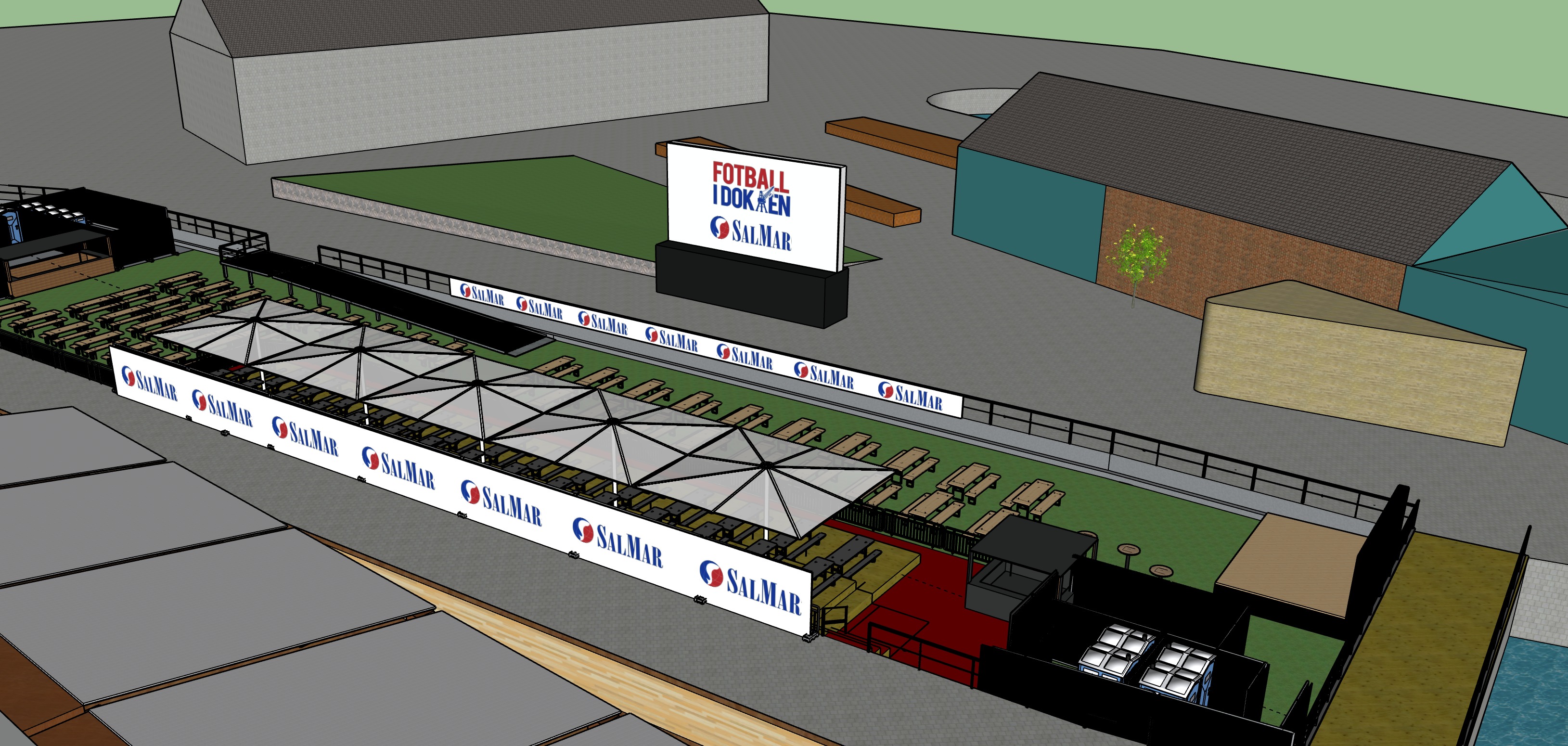 high end photorealistic waterfront event venue during golden hour at sunset use the exact geometry layout and sponsor branding from the base image do not change any logos text or branding placements large outdoor football screen as the main focal point with premium sponsor presence already integrated elegant black fences and crowd barriers with clean sponsor banners perfectly aligned and professionally mounted lively but controlled audience atmosphere adults enjoying football food and drinks in a premium outdoor setting scandinavian harbor environment with industrial buildings and a subtle maritime feel warm sunlight cinematic lighting long soft shadows realistic reflections on surfaces natural crowd behavior authentic body language no exaggerated cheering materials should feel real matte black metal fabric banners wood textures concrete ground sponsor presence should feel exclusive credible and high end not over commercialized ultra photorealistic architectural visualization quality sharp focus high dynamic range 4k realism