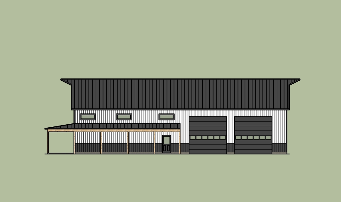 a modern two story polebarn with white vertical board and batten siding black vertical board and batten siding wainscoting black standing seam metal roofing black doors black windows natural timber posts supporting the half length covered porch retain the exact structure patio columns rooflines foundation height and proportions exactly as shown in the reference image add a smooth concrete front driveway extending toward the house integrated naturally into flat terrain surround the property with a lush dense forest of tall hardwoods place the sun behind the trees so warm golden sunlight beams through the branches casting soft rays and subtle dappled highlights across the patio siding and grass create ultra realistic lighting crisp shadows detailed textures in the wood siding and glass reflections and a vibrant clear sky with light atmospheric depth render in hyper realistic architectural visualization quality 8k resolution