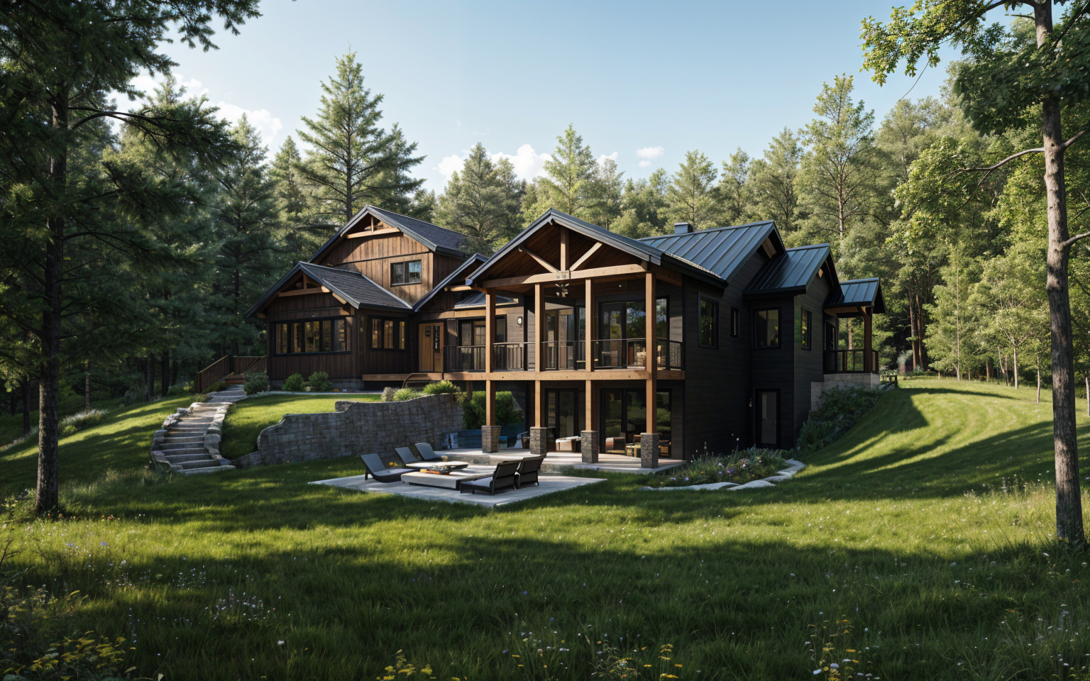 make an ultra realistic 4k render place the house in a forest in mont tremblant set the season to summer at midday use the current trendy cladding include a family sitting around the fire don t change the shape