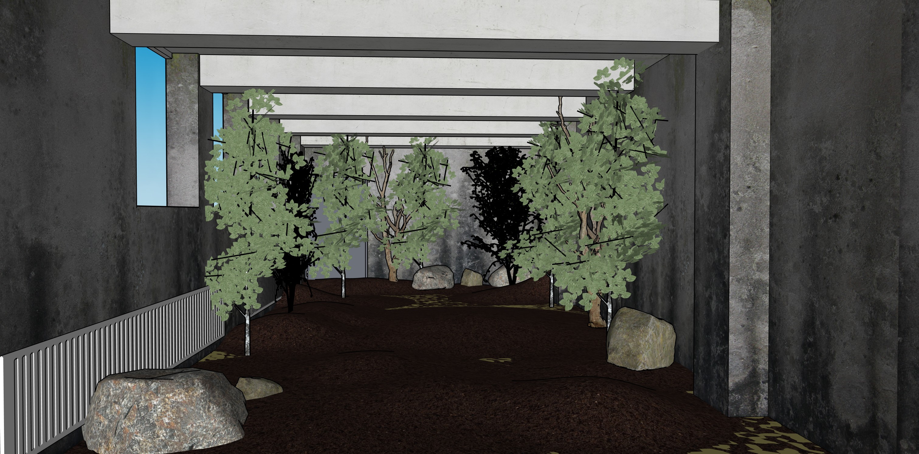 render the image in a sketchy watercolor style with visible pencil or ink outlines loose brushstrokes soft gradients and layered washes emphasize the raw organic and decayed feeling of the space while preserving architectural accuracy and realism in the environment render this architectural space exactly as it is without adding or changing any elements the room is a long narrow concrete corridor with visible ceiling beams and rough weathered walls on the left side tall rectangular windows allow in a soft dim twilight the floor is covered in dark soil from the garden and the space contains large rocks bare tree trunks and branches all elements materials and their placement must remain unchanged from the original layout apply dramatic slightly eerie twilight lighting entering from the windows on the left casting long shadows and enhancing the atmosphere with contrast between warm fading light and darkness the overall mood should be quiet mysterious and slightly unsettling