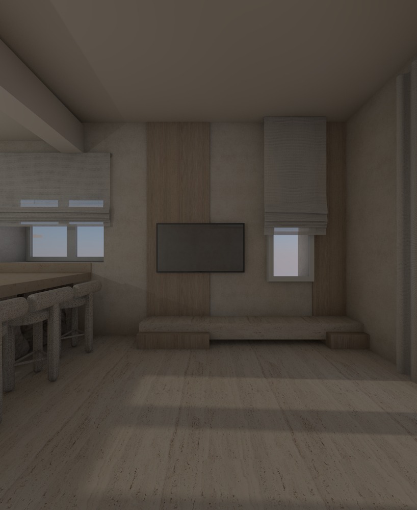 create a highly realistic render of a warm and minimal living space with a calm and serene atmosphere the design is cohesive natural and refined with a soft neutral palette and a balanced composition the main feature is a tv wall composed of vertical light oak wood panels creating a clean and architectural backdrop a wall mounted flat screen tv is centered on the panel maintaining a minimal and integrated look below the tv there is a low built in bench in the same wood finish extending horizontally and blending seamlessly with the wall composition the design is simple monolithic and grounded on both sides of the central panel the wall is finished in light beige microcement creating a soft contrast with the vertical wood element there are two windows with roman shades in a natural linen fabric in a soft beige tone the fabric appears slightly textured and diffuses the incoming light gently natural light enters through the windows creating soft elongated shadows on the floor and enhancing the depth and warmth of the space on the left side part of the kitchen island is visible along with bar stools featuring light oak wooden legs and seats upholstered in light beige linen fabric maintaining material continuity across the space on the right side full height curtains in an off white linen fabric add softness and verticality to the composition the flooring is in a light natural stone tone enhancing the calm and cohesive aesthetic the overall lighting is soft and natural with minimal contrast creating a warm inviting and high end atmosphere ultra realistic render high resolution premium materials interior design magazine photography style