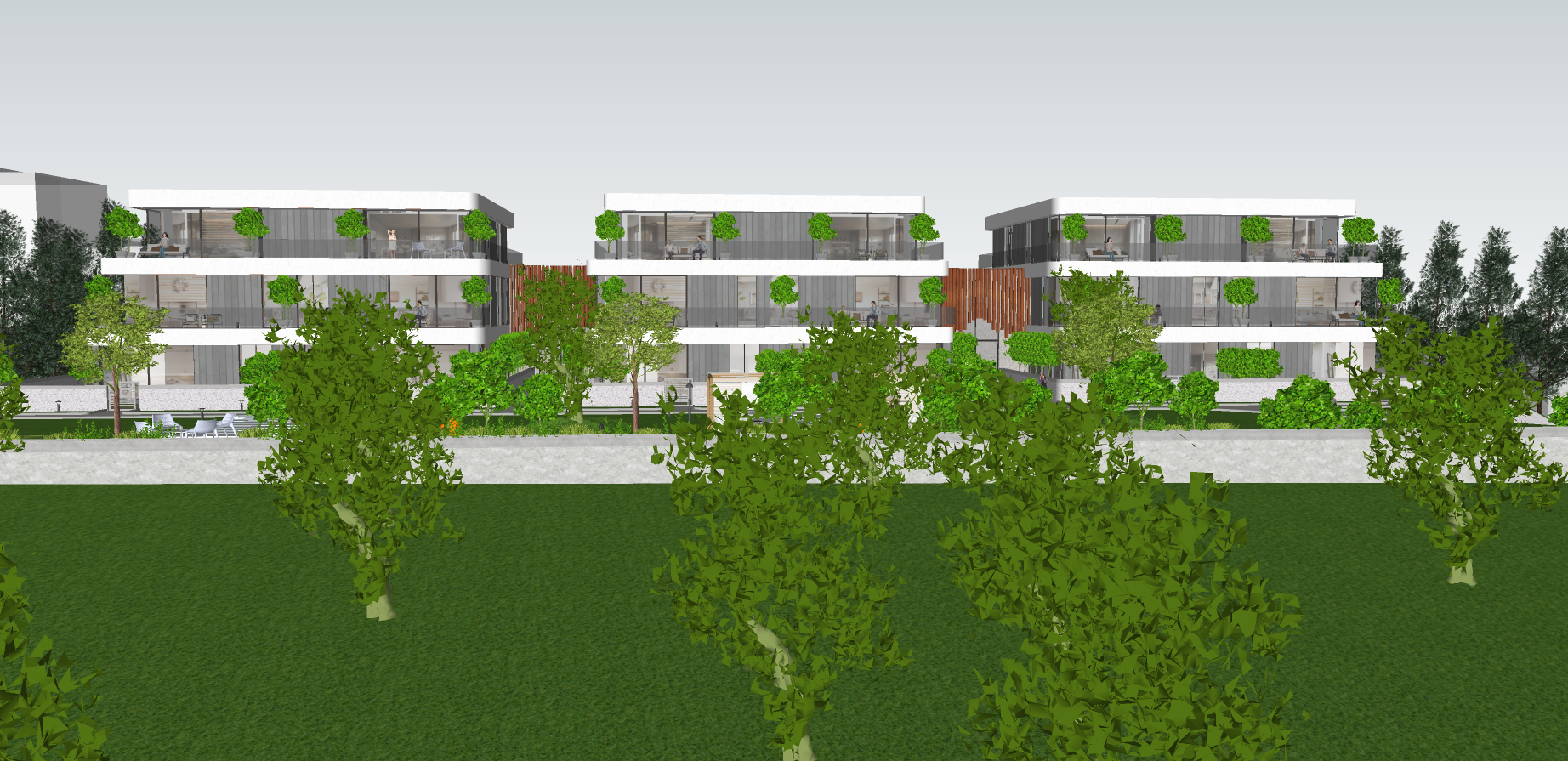 a modern architectural scene depicting white contemporary buildings with large wavy glass windows and vertical gardens the buildings feature lush green plants contrasting with the sleek white facade the scene includes a smooth asphalt road in dark gray with neatly painted white line markings surrounding the buildings are vibrant green lawns and trees adding a sense of nature and tranquility the atmosphere is serene with a cloudy sky providing a soft diffused light that highlights the modern design and natural elements