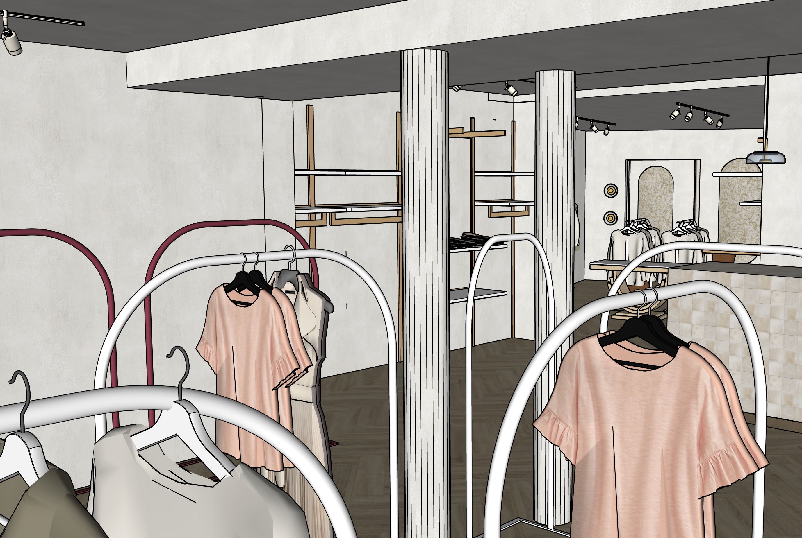 add realism make clothes from soft pastel beige colors square entry in the back leads to fitting rooms