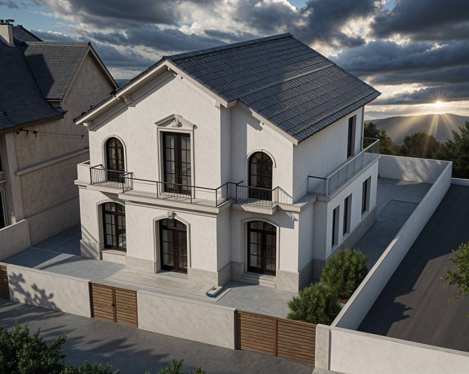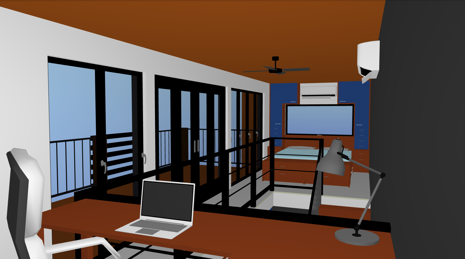 this is the office loft space of a modern tiny home with the bedroom loft in the background place a comforter and pillows on the bed perspective is looking at the bedroom portion of the loft from the office space with a set of tall windows and a black glass 4 piece bi fold door in between the sets of windows going out to the second floor outdoor deck the ceiling and floor should be a matched cedar plank with the wall to the right being painted matte dark grey outdoors show the mountains and forest of the pacific northwest lighting should be golden hour