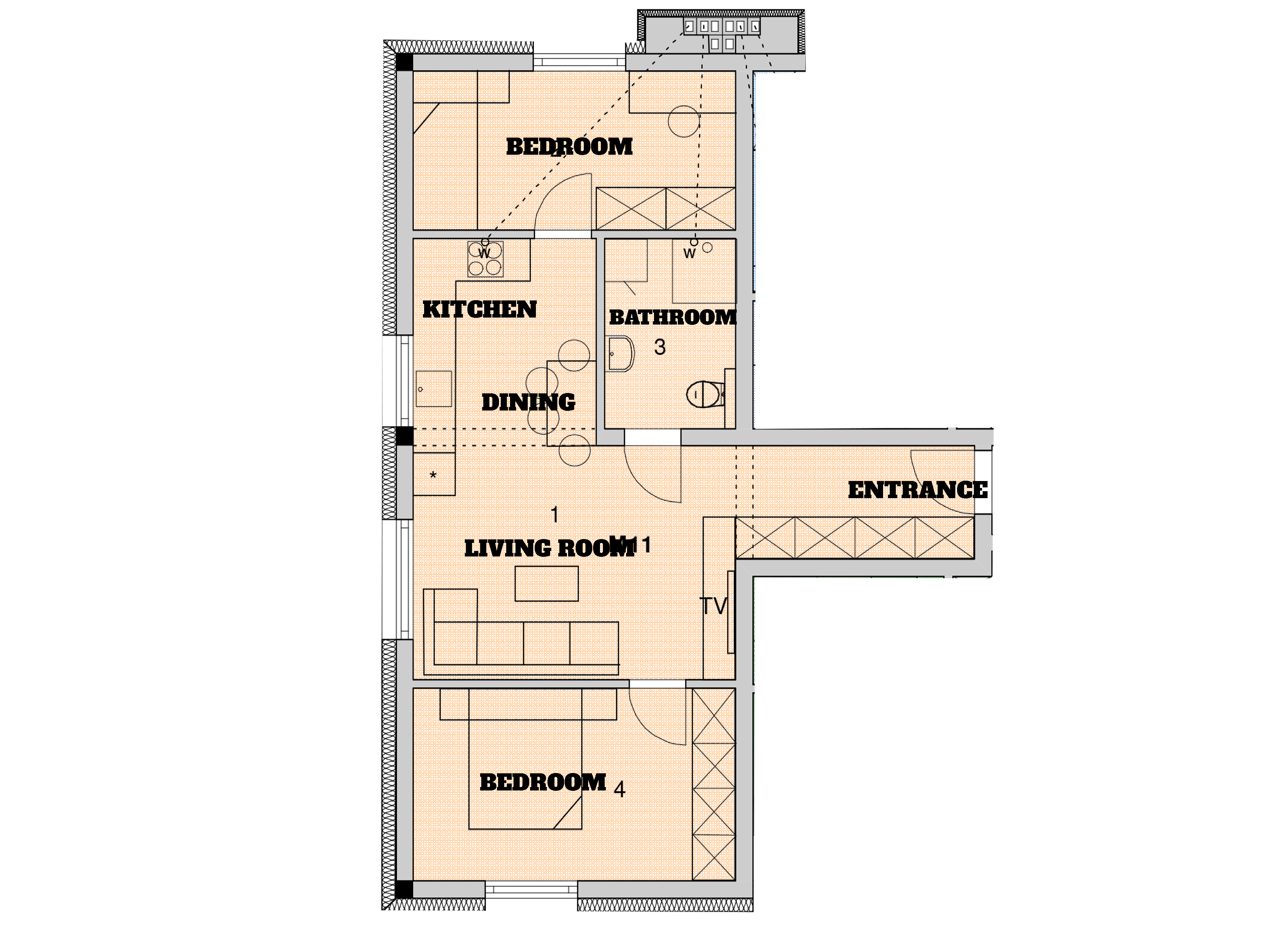 convert this floor plan into a realistic isometric 3d view of a full house show the space from an elevated angle with furniture walls and details visible create a beautifully detailed rendering of a modern apartment floor plan emphasize elegant and clear lines with a minimalist design use warm orange tones for the rooms complemented by sleek cool gray for the walls and outlines add gentle ambient lighting to create a welcoming atmosphere include subtle textures to add depth to the spaces and enhance the overall harmony with soft natural light filtering into each room transform this floor plan into a clean high quality real estate presentation critical keep the layout exactly the same do not change room shapes walls proportions or structure do not redesign or reinterpret the plan preserve all geometry perfectly pixel accurate make rooms inside only background clean white or very light neutral background remove any surrounding building context if present use the same furniture as shows on the plan do not change the orientation of the floorplan