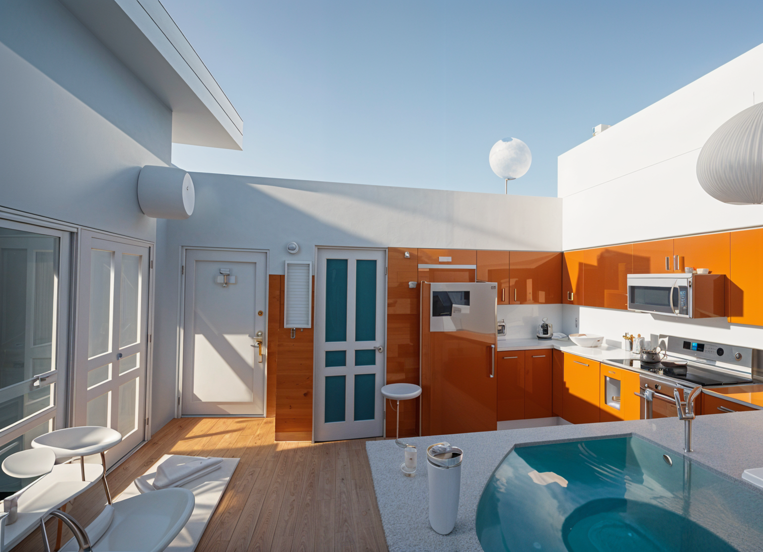 create a photorealistic rendering of a two story elevated modern coastal home precisely matching the provided architectural elevation architecture materials upper level light blue horizontal siding with two double hung windows lower level and left wall sections vertical slatted or louvered wood panels in natural or weathered tone all window and door frames in black with clean modern trim main roof and porch roof to be the same pitch and standing seam metal material in galvanized or matte gray front porch includes a shallow metal awning roof a wide sliding glass door in the center and a main entry door to the right include black horizontal railings on the balcony and stairs hardscape landscaping house is elevated on pilings install light gray or ivory pavers in the front as a driveway continuing beneath the house and extending to the rear pool deck surround the property with minimal neatly maintained coastal landscaping low native grasses dwarf palms or sparse tropical shrubs with clean borders pool place an inground rectangular pool directly behind the home centered and clearly visible from the front perspective the pool should have a smooth paver border matching the driveway setting location place the home within a real fort myers beach context sandy terrain bright turquoise gulf waters in the near background surrounded by neighboring beach houses in various pastel or coastal tones similar to newly built or rebuilt stilt homes some vegetation like palm trees and sea oats can be sparsely present lighting mood bright florida coastal daytime sunlight crisp shadows clear blue sky with a few clouds overall style modern florida coastal stilt home with scandinavian minimalism clean refined beachside luxury