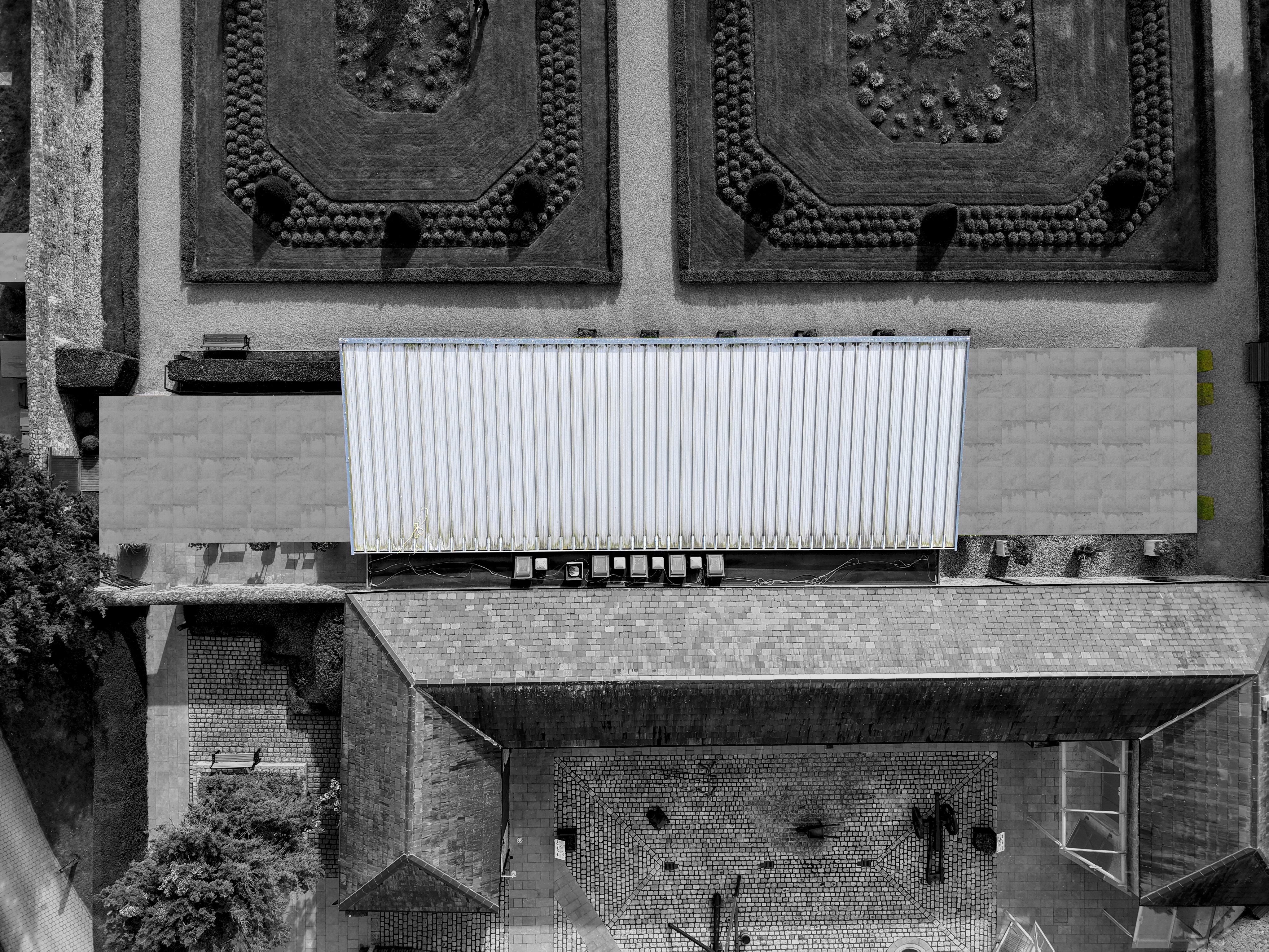 modernist aerial shot aerial view of a symmetrical garden and outdoor seating area render the garden in lush vibrant greens with hints of deep forest greens for the hedges capturing a serene and peaceful atmosphere the pathways are light gray gravel the outdoor seating area features wooden tables and chairs in a warm rich brown resting on a polished light grey patio a modern sleek structure with a white slightly glossy roof spans the scene enhance the natural light to create soft shadows evoking a calm and inviting atmosphere architecture
