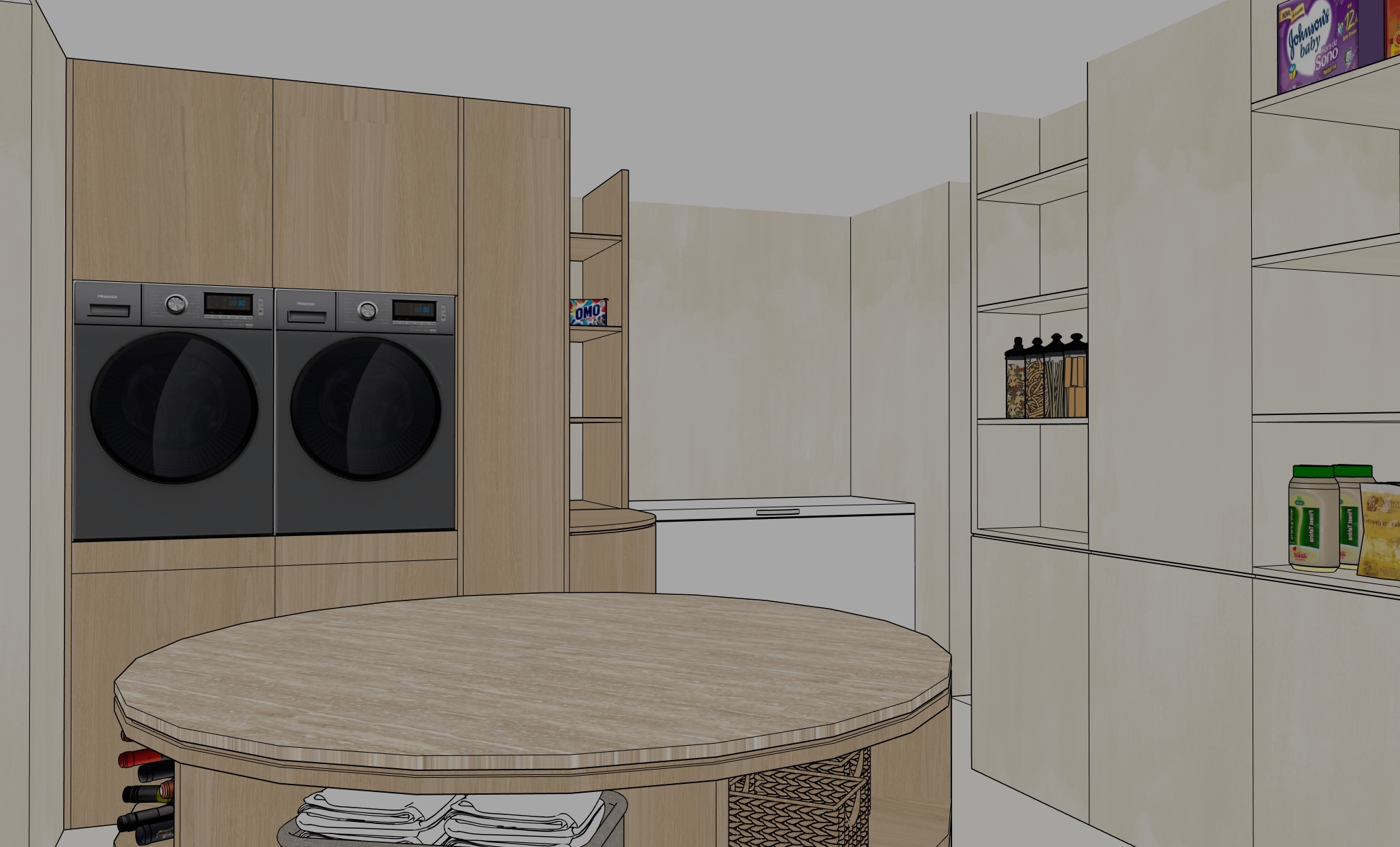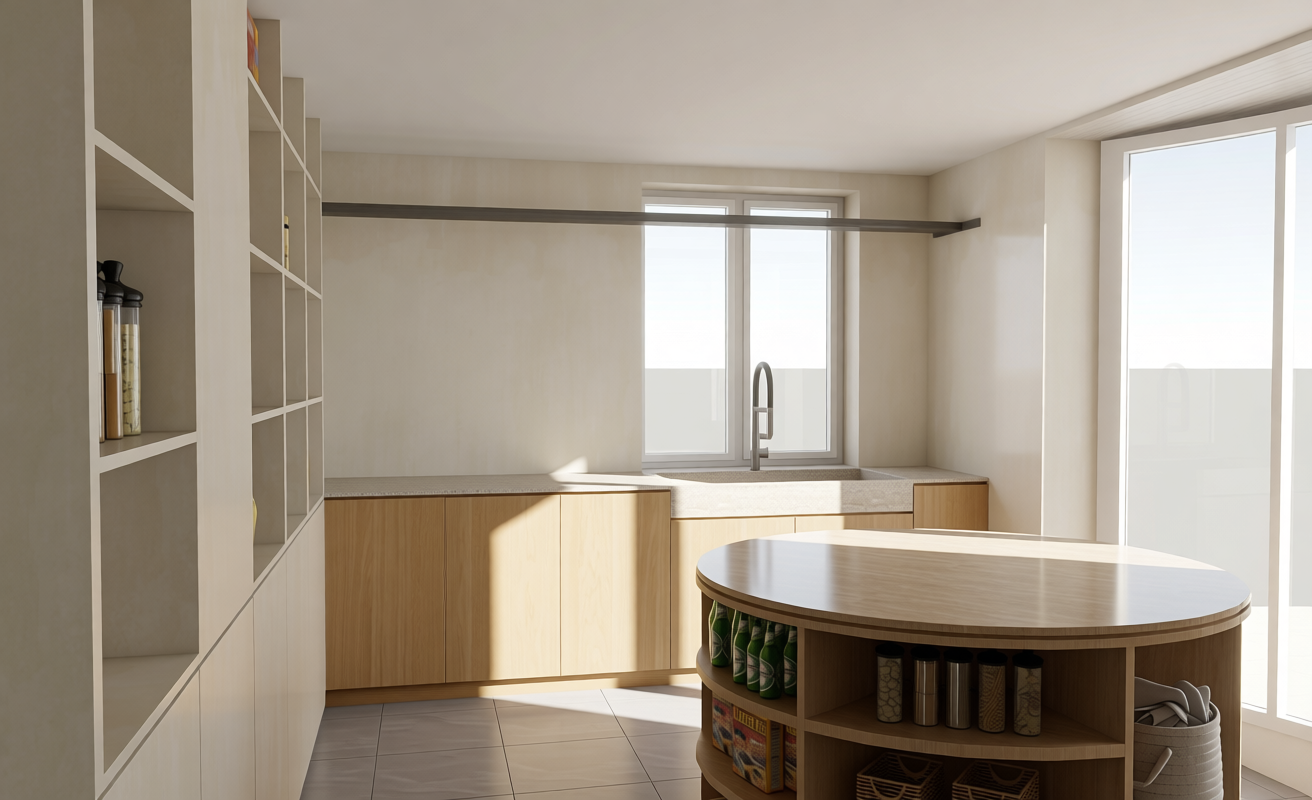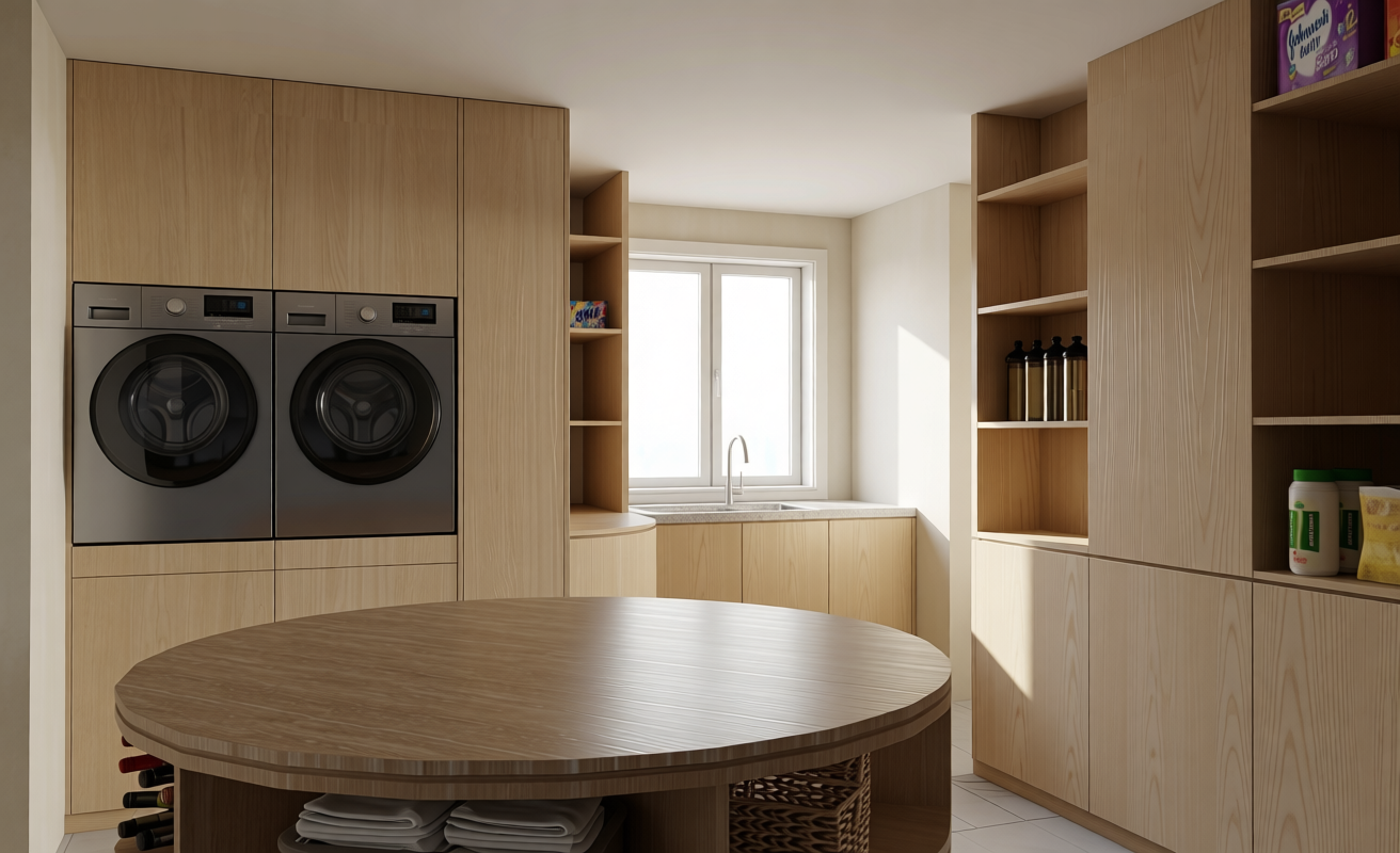 the right side cabinet is painted with textured limewash giving it a soft slightly rustic appearance the cabinet containing the washing machines is made of light oak with a smooth finish standing next to a white freezer chest in the center a kitchen island of light oak features a travertine countertop with subtle natural veining the scene is well lit with natural daylight highlighting the contrast between the limewashed cabinet the light oak surfaces and the stone countertop the overall atmosphere is warm inviting and contemporary with a clean and organized layout