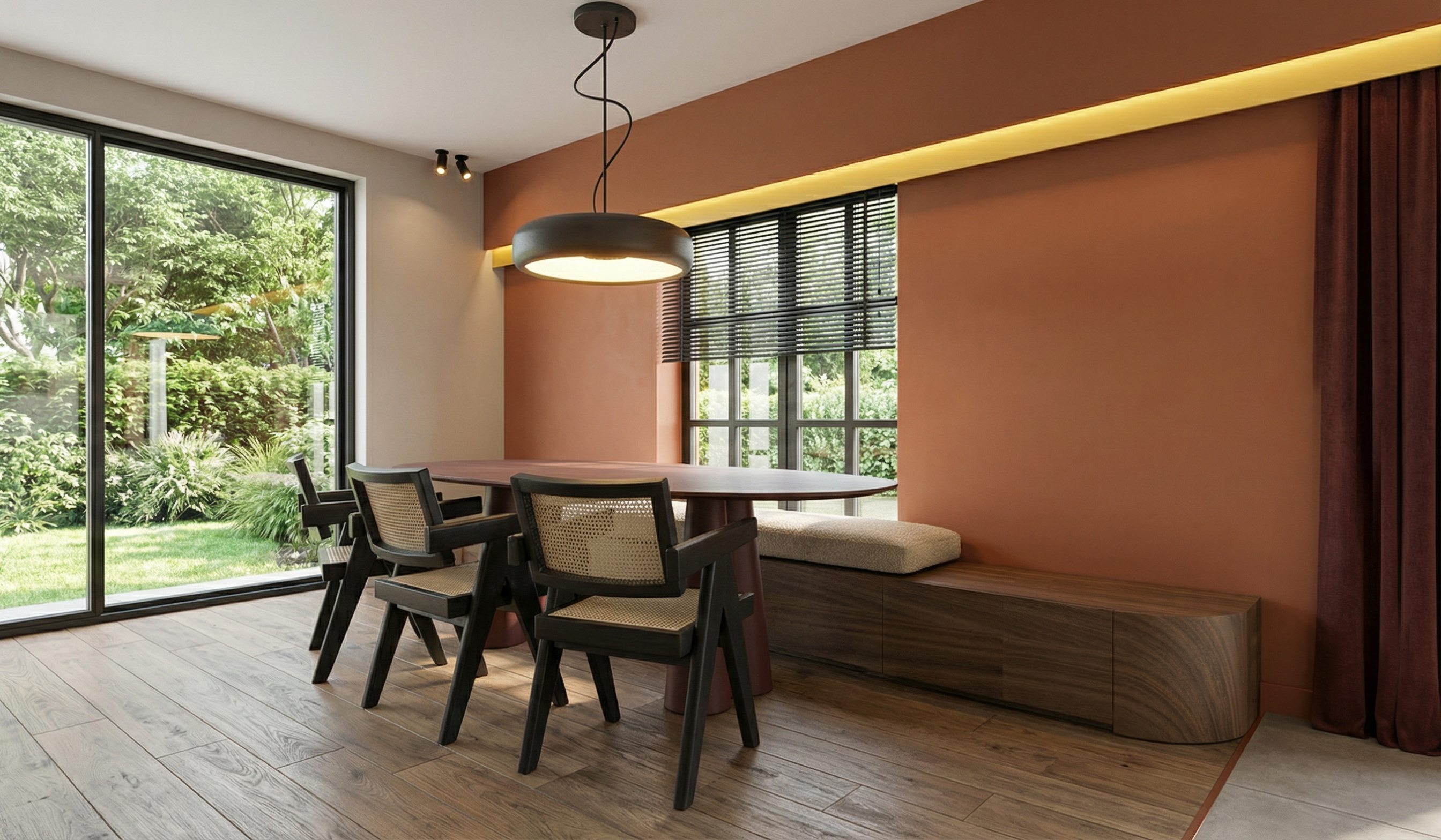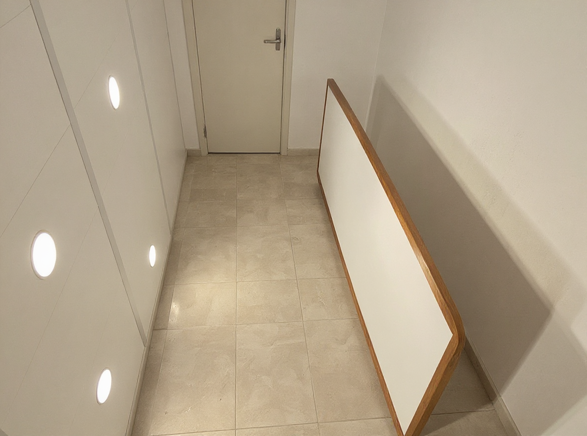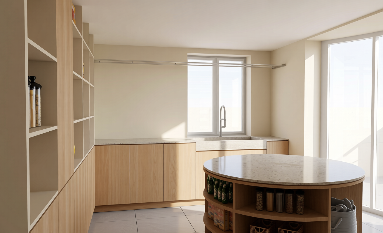 the right side cabinet is painted with textured limewash giving it a soft slightly rustic appearance the cabinet containing the washing machines is made of light oak with a smooth finish standing next to a white freezer chest in the center a kitchen island of light oak features a travertine countertop with subtle natural veining the scene is well lit with natural daylight highlighting the contrast between the limewashed cabinet the light oak surfaces and the stone countertop the overall atmosphere is warm inviting and contemporary with a clean and organized layout