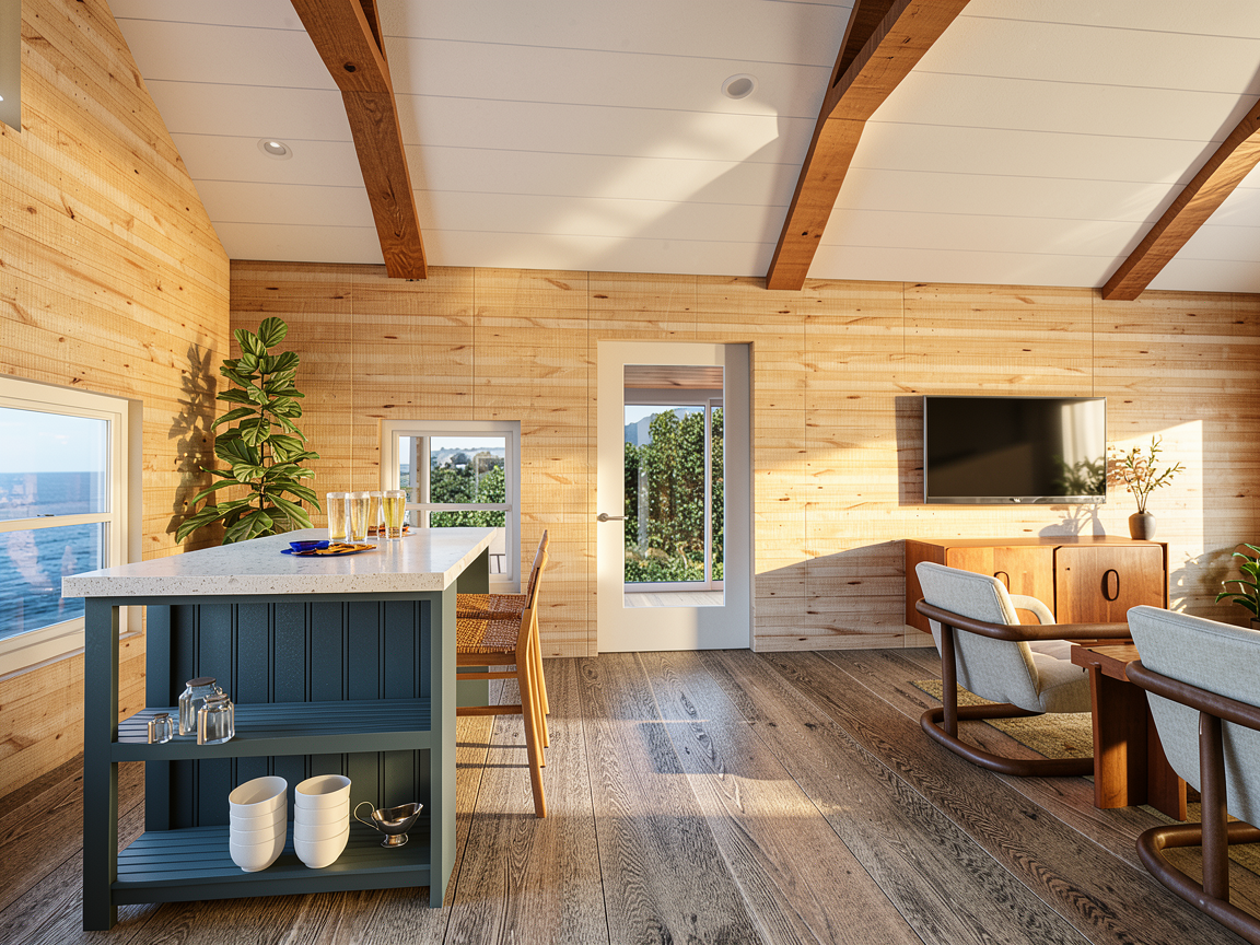 make face of home vertical cedar paneling that is stained reddish make the dark side metal black paneling and add a nice flowers and trees to the backround the roof is also black standing seam paneling and move the direction of the sun to light up the other side too perspective view