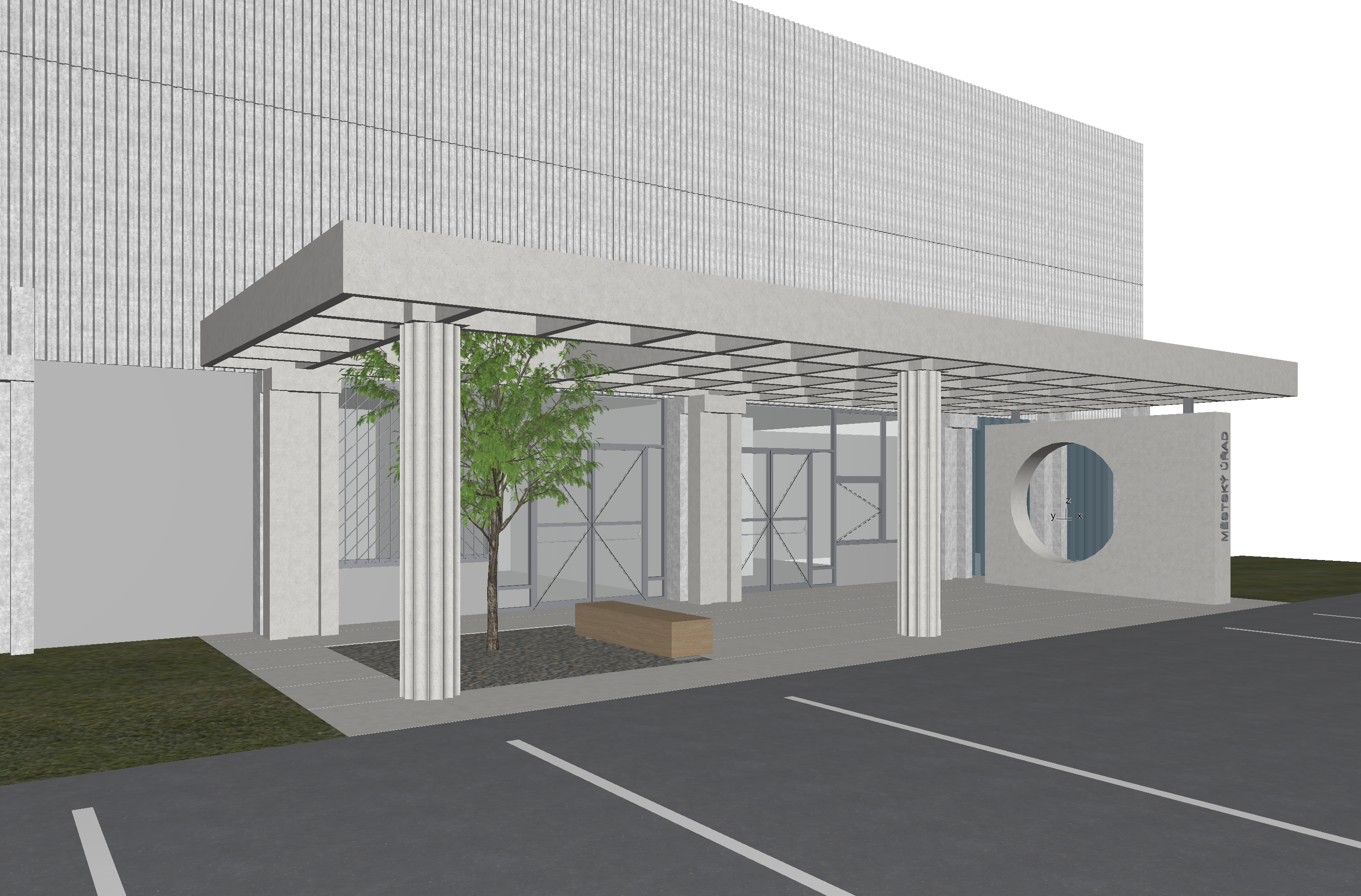 entrance roof to the brutalistic concrete building it is summer sunny wheather people are comming inside waiting and sitting in the front of building