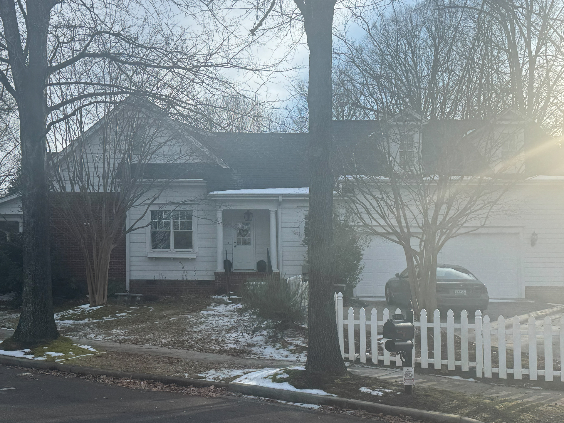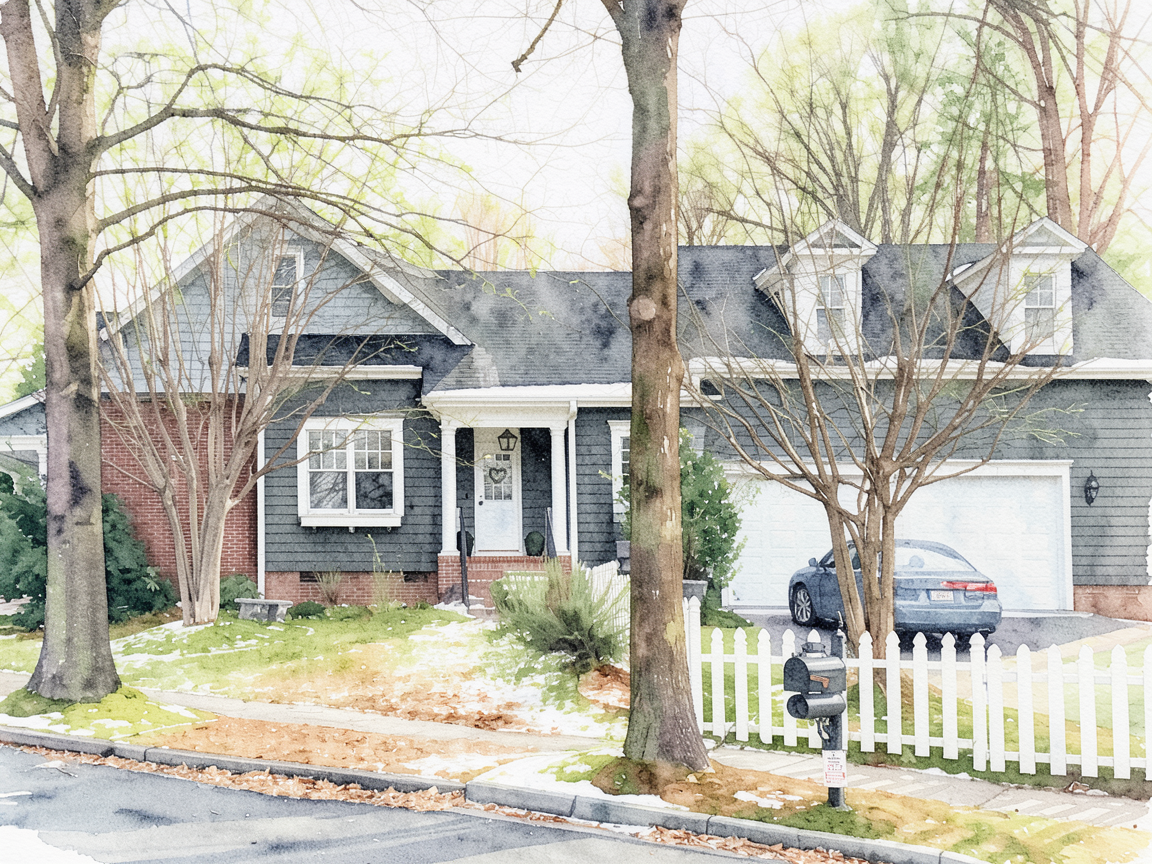 watercolor render of this house maintaining it s current materials watercolor trees and landscaping surrounding the building change the color of the horizontal white siding on the house to match the color kendall charcoal from the benjamin moore color palette change the color of the siding on the gables to match the color kendall charcoal from the benjamin moore color palette