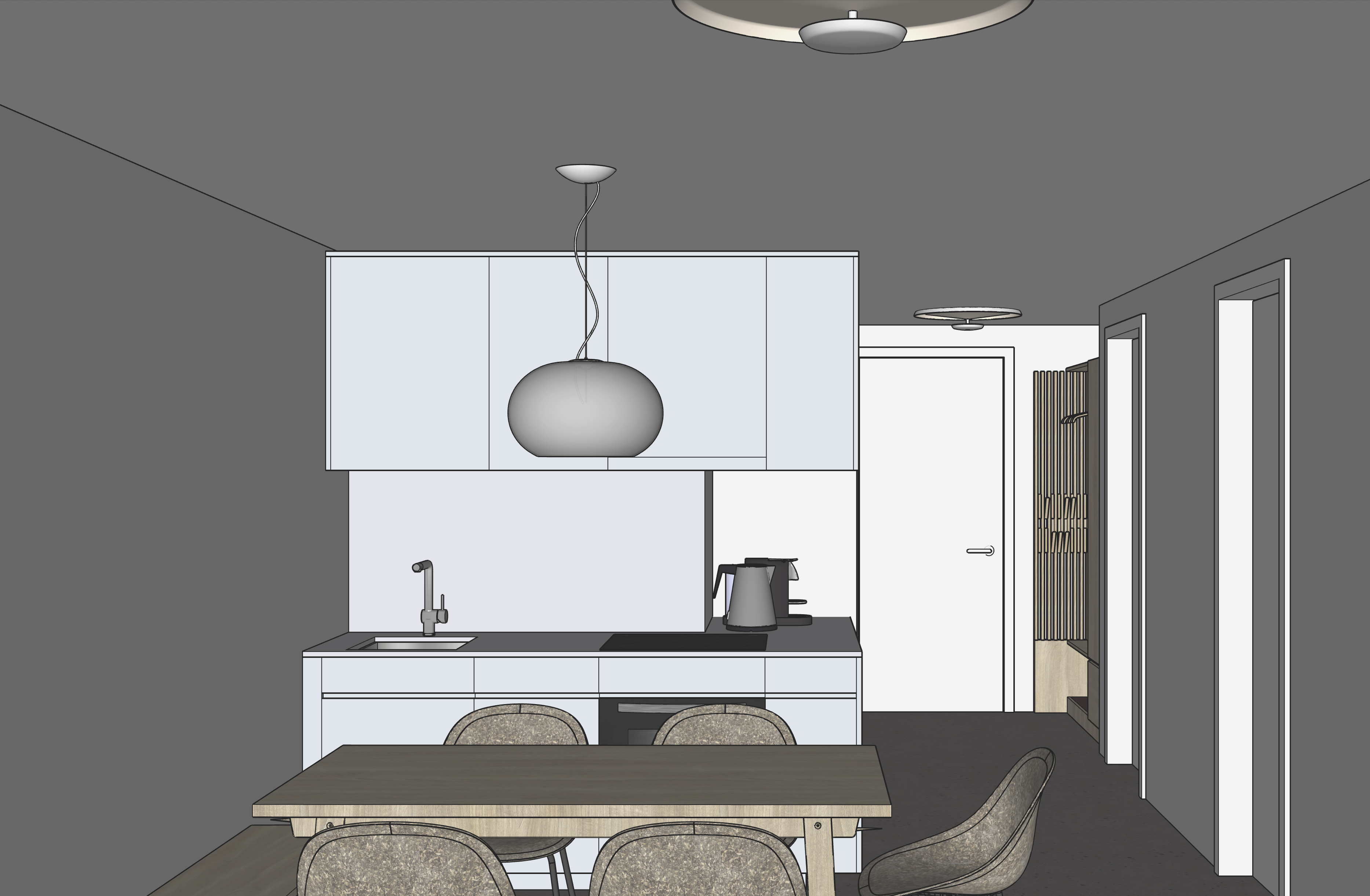 high resolution photorealistic rendering of a contemporary open plan apartment interior captured from the exact same angle and composition as the reference image a wide shot encompassing the kitchen area dining table and hallway entrance the mood is minimalist inviting and functional set in a tranquil morning light lighting atmosphere soft natural morning light fills the room subtly highlighting surfaces and textures the translucent grey pendant lampabove the dining table emits a warm inviting glow 2700 kelvin creating a focal point and enhancing the cozy atmosphere the overall lighting is balanced clean and bright suggesting a calm start to the day materials colors walls and ceiling smooth matte finish in a pale grey blue tone ncs s1002 r50b creating a serene and expansive backdrop floor seamless terracotta colored terrazzo ncs s4030 y80r with fine white grey and black chips subtle matte sheen kitchen cabinetry sleek modern design in a muted grey blue ncs s2005 r70b with a subtle matte finish kitchen counter and backsplash integrated seamlessly with the cabinetry in the same muted grey blue ncs s2005 r70b maintaining a cohesive and clean aesthetic dining table light oak wood with a natural matte finish showcasing visible grain and texture dining chairs ergonomic design crafted from a matte hemp material providing a tactile and natural contrast pendant lamp translucent grey material softly glowing with a warm 2700k light door frames crisp white creating clean lines against the wall color styling details the composition feels clean and thoughtfully designed showcasing modern craftsmanship and a harmonious color palette subtle reflections on the kitchen surfaces natural texture and folds in the hemp chairs soft shadows defining the spatial arrangement and furniture photography style architectural interior photography with straight verticals and a slightly wider depth of field to capture the expanse of the open plan the focus is on clean lines and material interplay clean crisp image no film grain balanced contrast the authentic daylight and artificial light rendering create a sense of calm modern living