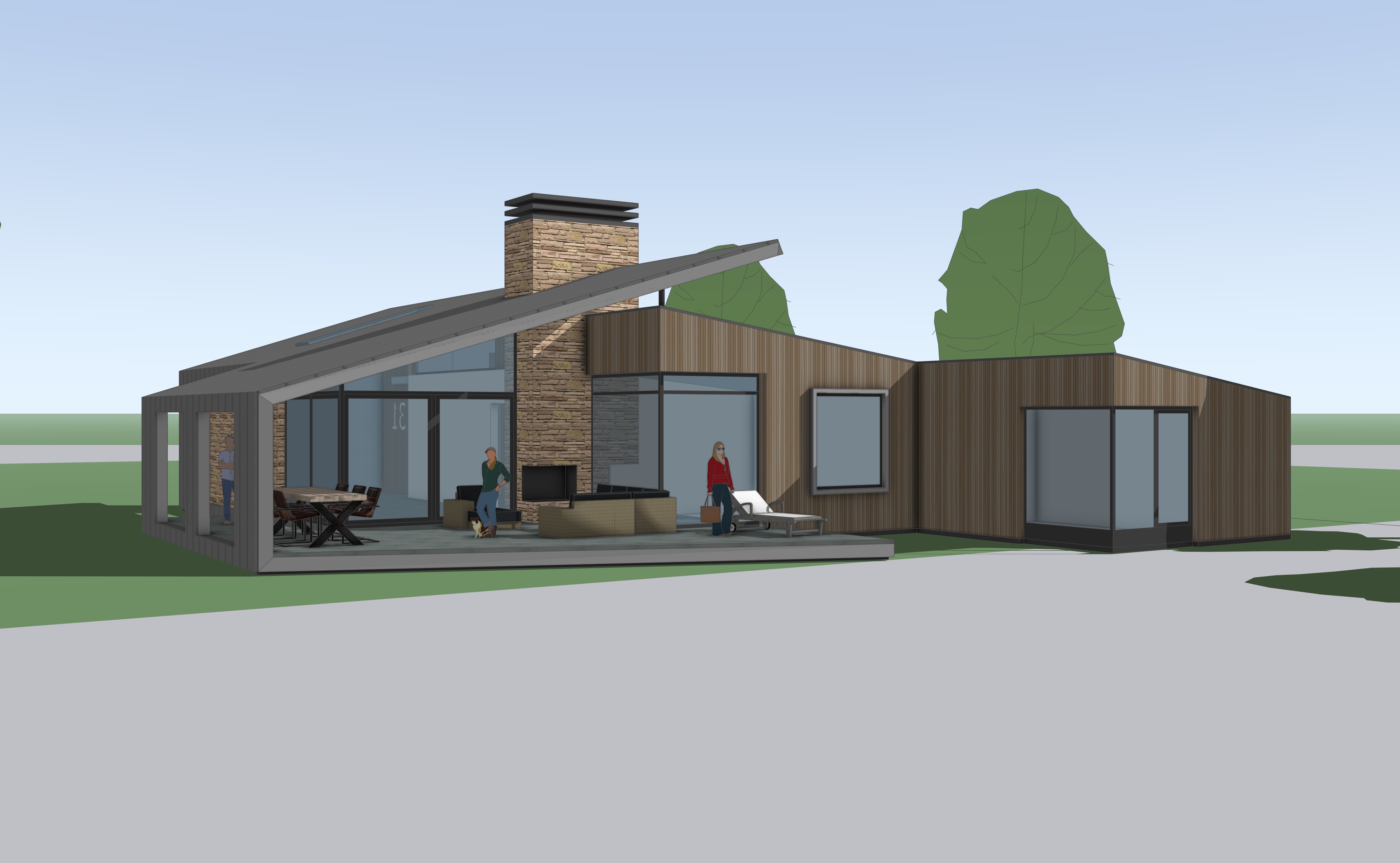 the house is surrounded by a lush green garden with grass bushes flowers and a lot of trees the weather is sunny with a few clouds in the sky
