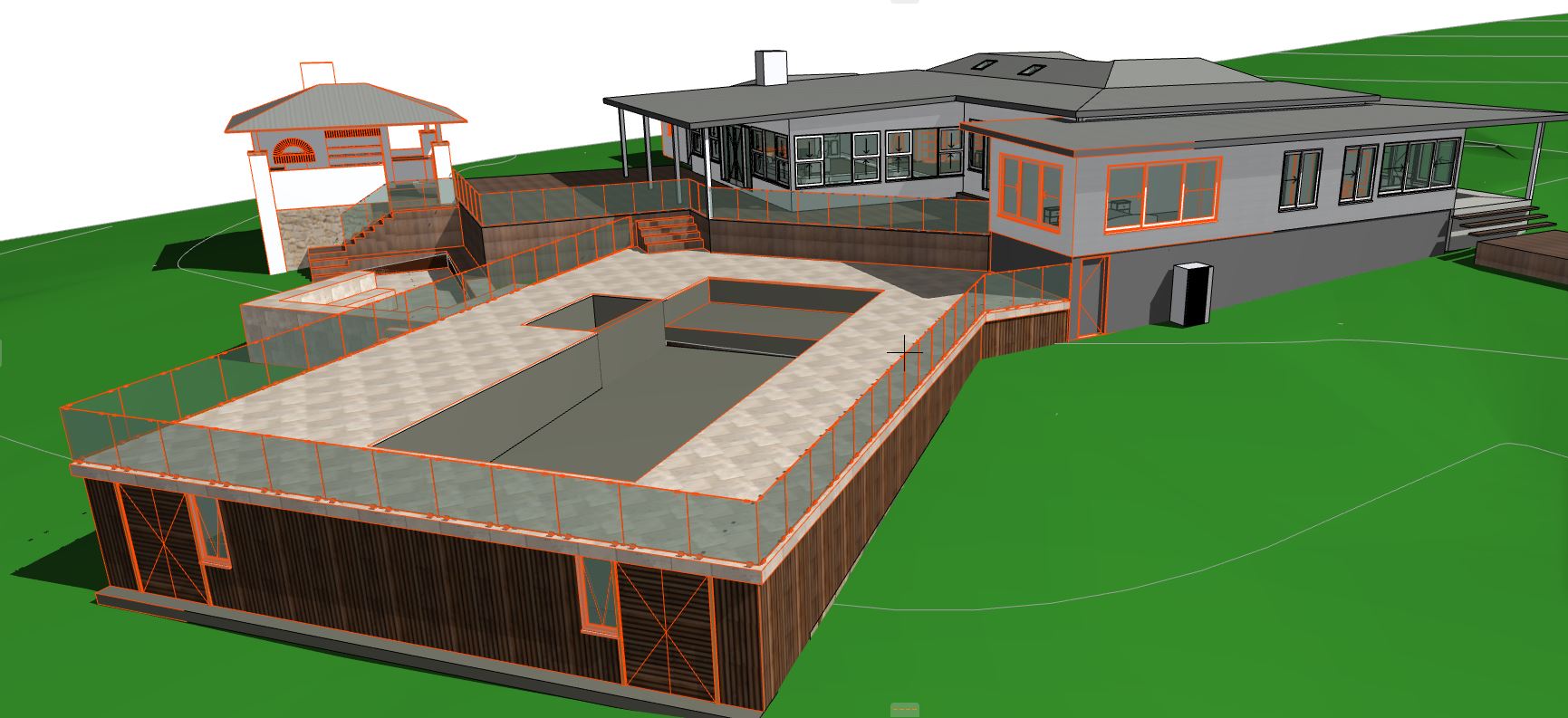 exterior shot render a modern architectural scene featuring a house with a spacious terrace and pool area surrounded by lush green lawns the main house has white weatherboard cladding and has large reflective windows the roof is light grey sheet metal the terrace is adorned with frameless glass fencing and paved with light grey natural stone tiles create a serene and inviting atmosphere with soft golden sunlight casting gentle shadows enhance the scene with a clear blue sky for a peaceful and refreshing ambiance
