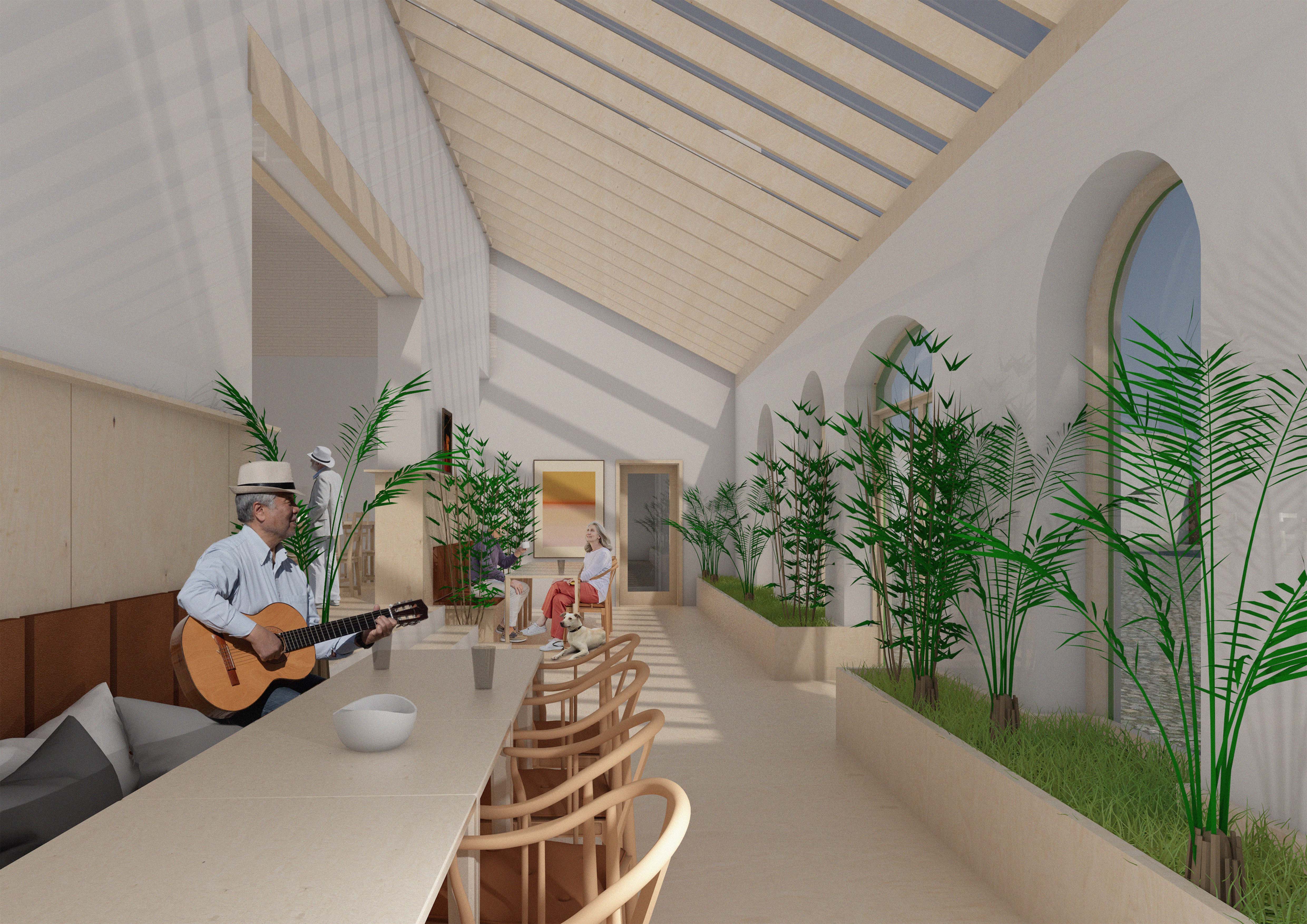 a wooden structure covering a modern cabin standing on a concrete pier surrounded by rough ocean architecture