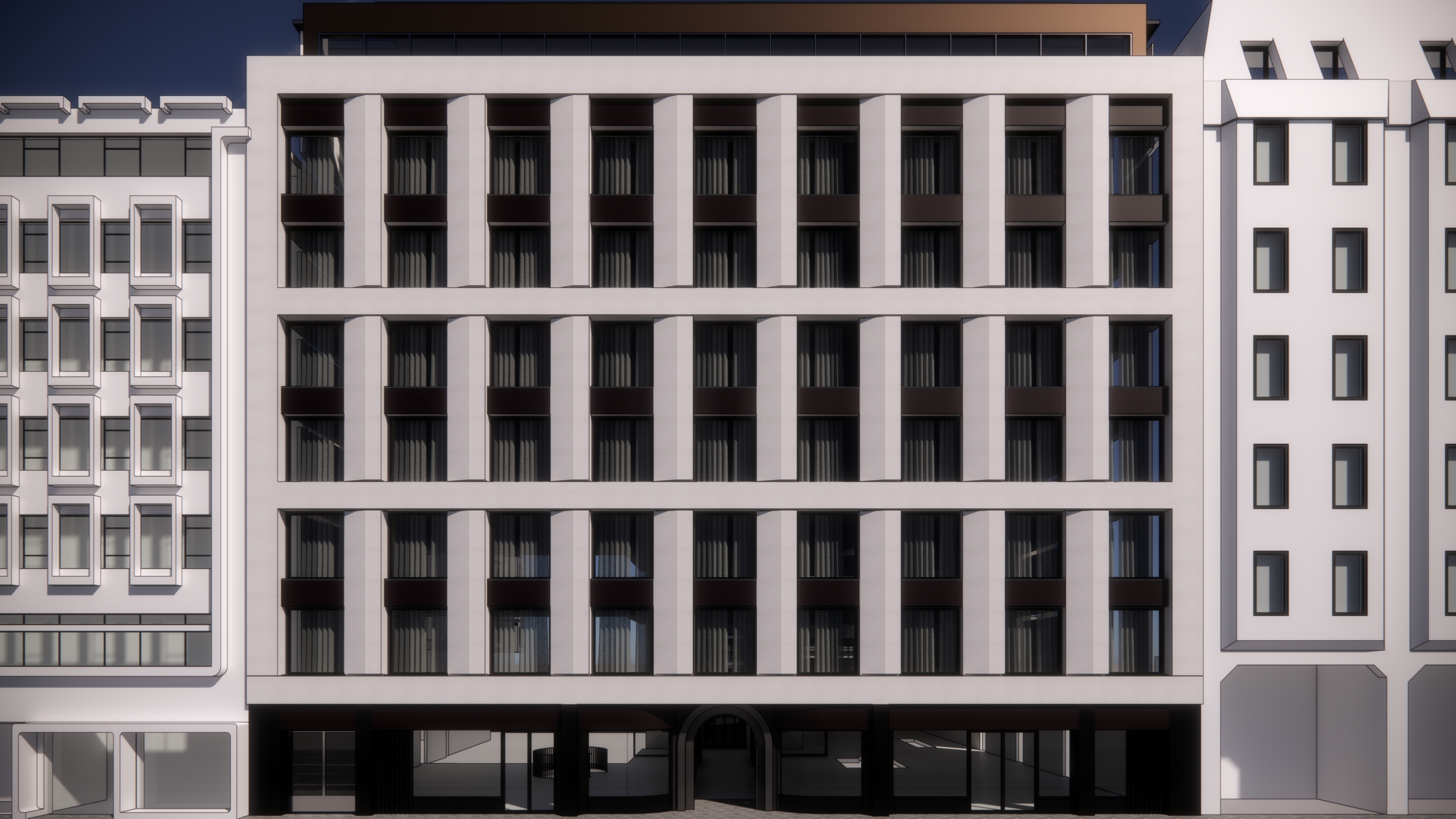 this is a light white stone facade please improve materials and reflections on the ground floo add some people and restaurant on the back keep the ground floor material as a metal black