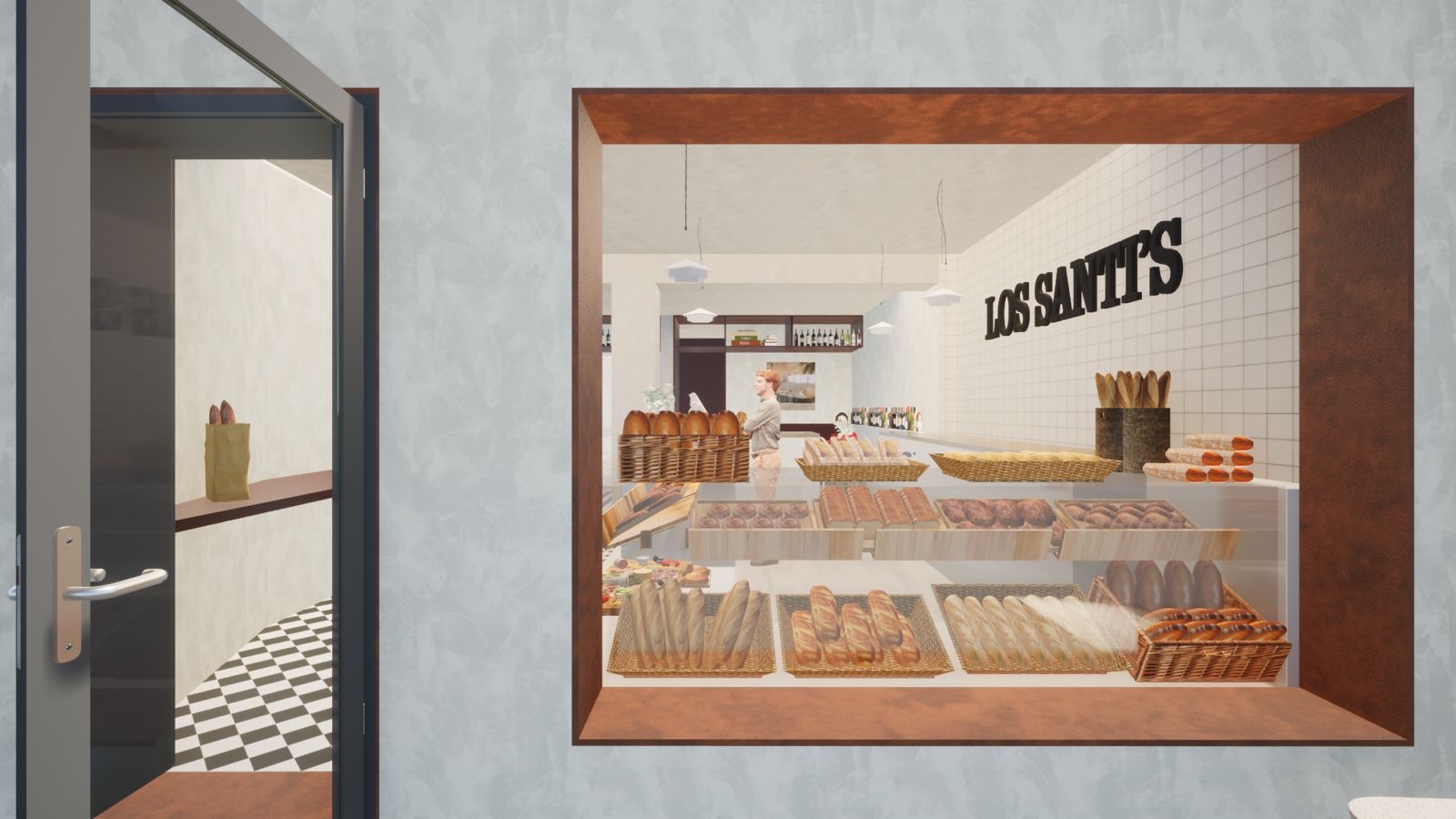exterior shot bakery shop window with fresh bread and pastries on display tiled white wall with los santt s sign warm natural daylight realistic textures of bread and glass ultra realistic render architecture