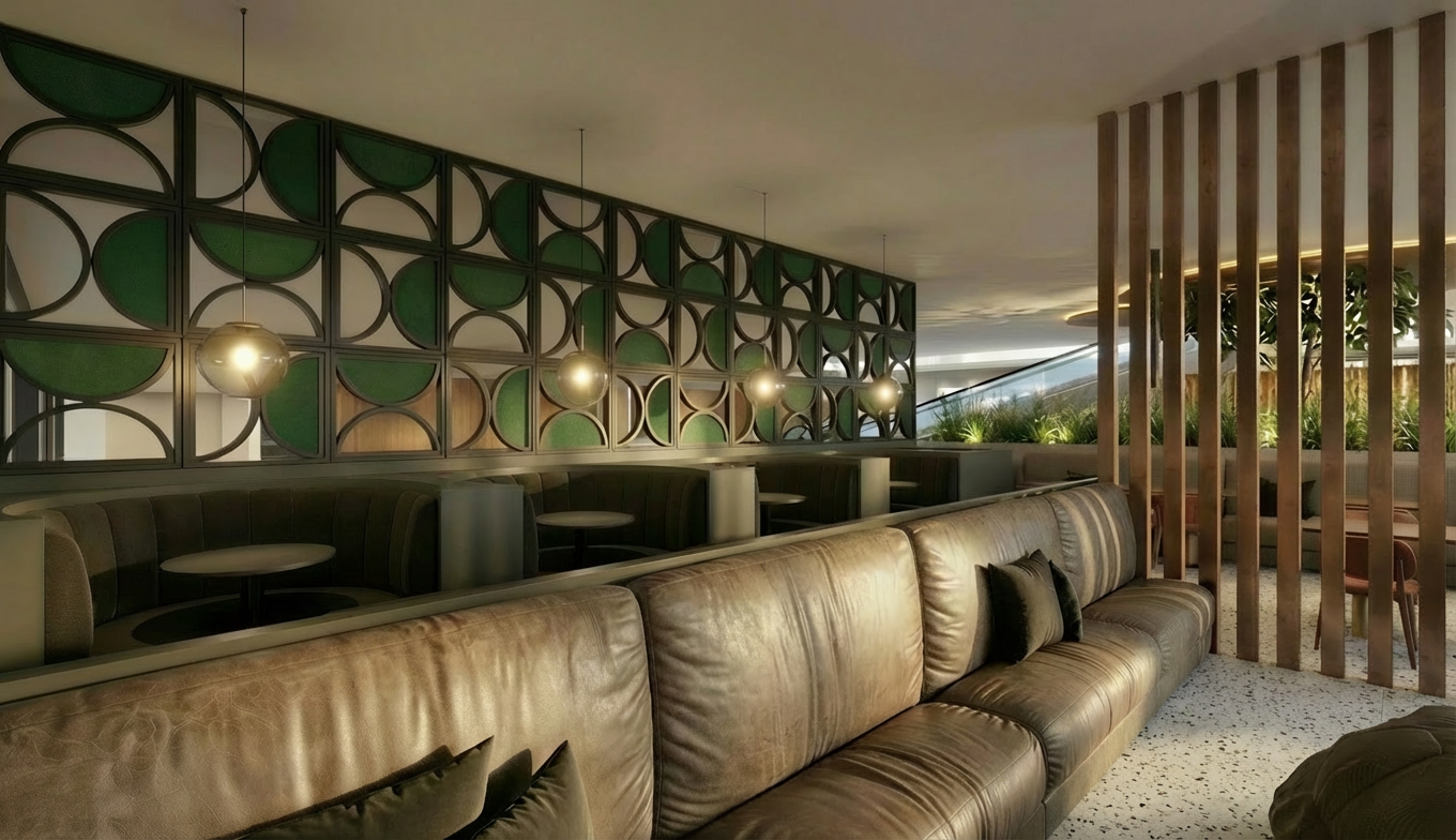 hyper realistic architectural photography high end interior design soft natural sunlight streaming through windows long soft shadows subtle ambient artificial lighting dimmable warm led accents realistic textures 8k resolution highly detailed shot on phase one xf global illumination raytraced reflections clean minimalist aesthetic lock all previous settings subject the original room divider from the scene with its geometry and structure completely unchanged the green semi circular panels integrated within the divider frame are now rendered with a highly tactile pressed non woven felt texture the felt must display realistic micro fibers a soft matte appearance and tangible depth under the soft natural lighting strictly following the existing shape of the half circles the felt color remains green all other scene elements furniture and lighting remain identical