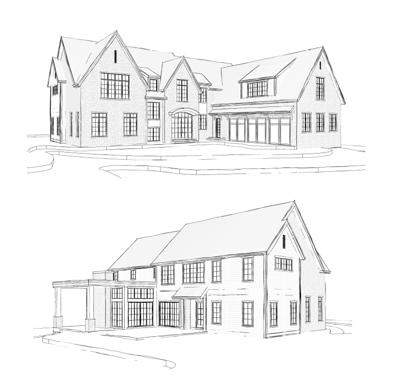 please give me a photo realsitic image use a greyish stone with a hint of brown and red in an ashlar cut style where it indicates stone where it indicates siding use a warm white siding material make the windows dark brown