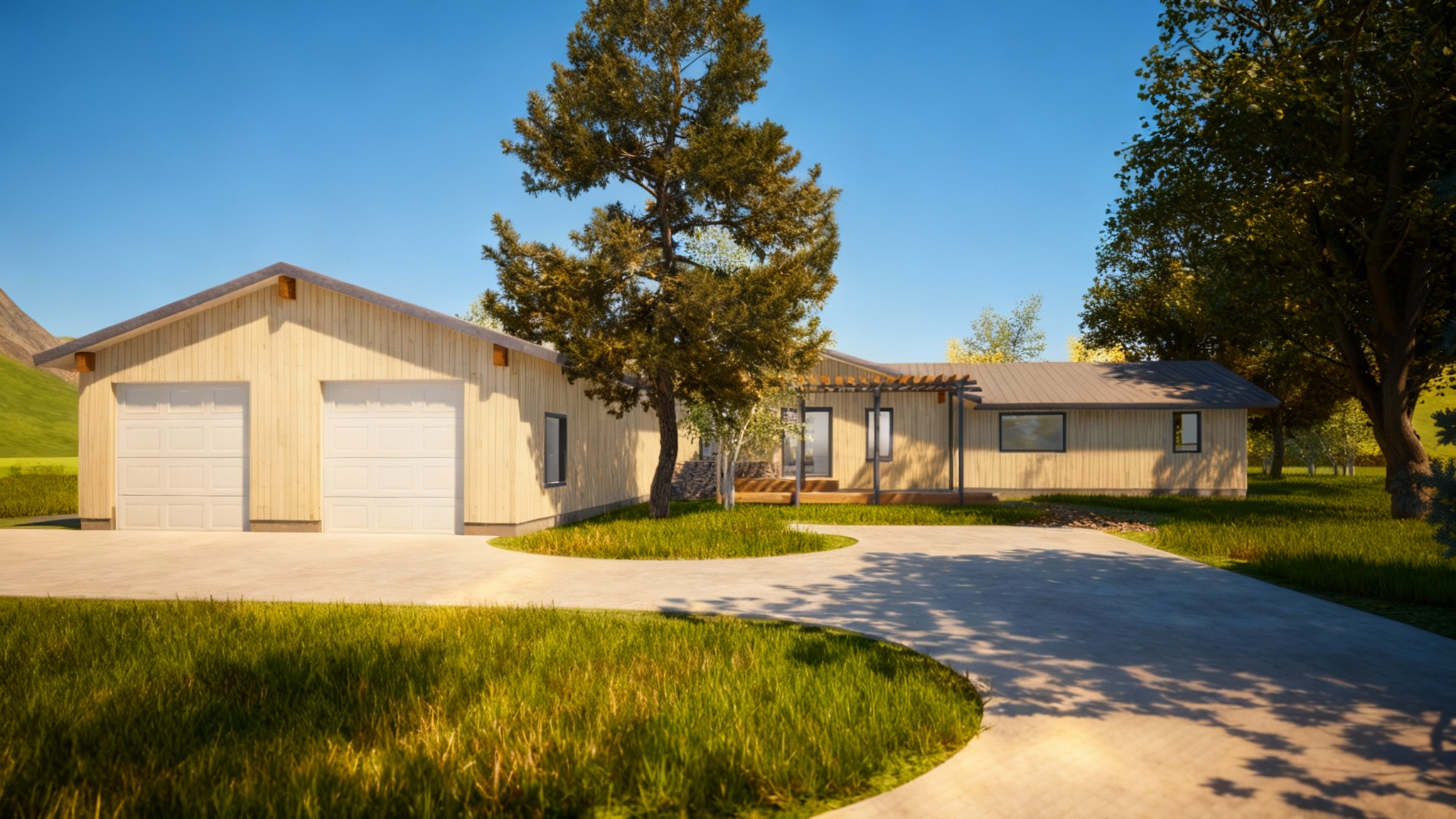a manicured lawn layered flower beds low maintenance shrubs native plants stone pathway leading to the entrance