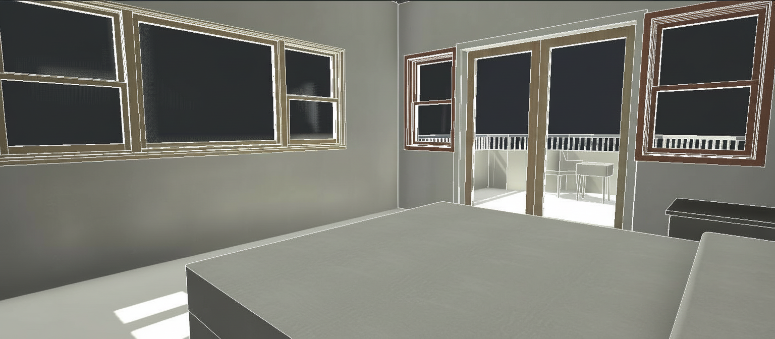 please make the lighting soft even warm and bright keep material as they are shown in the image add a view of city buildings outside the window the back wall is a warm dark gray as shown in the image the tv is inset into the wall as shown in the image