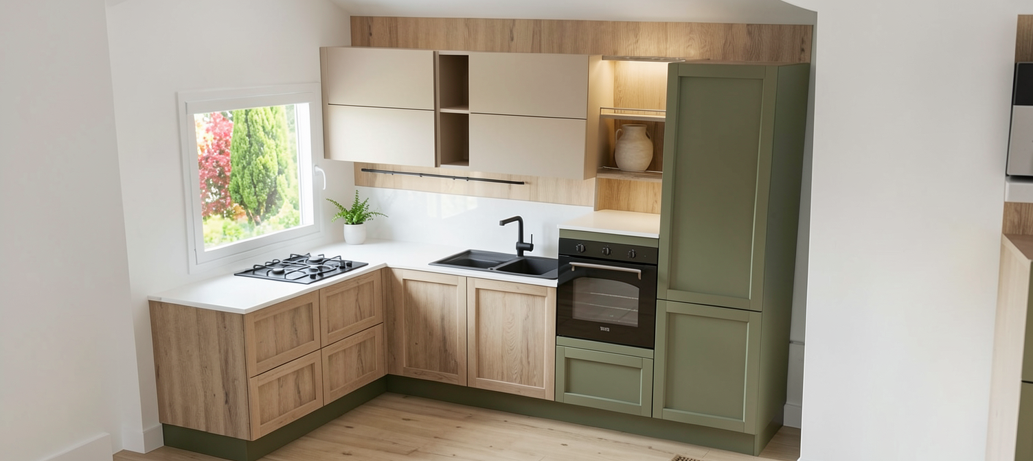 change the soft beige color of the wall cabinets to verde lanza soft olive green