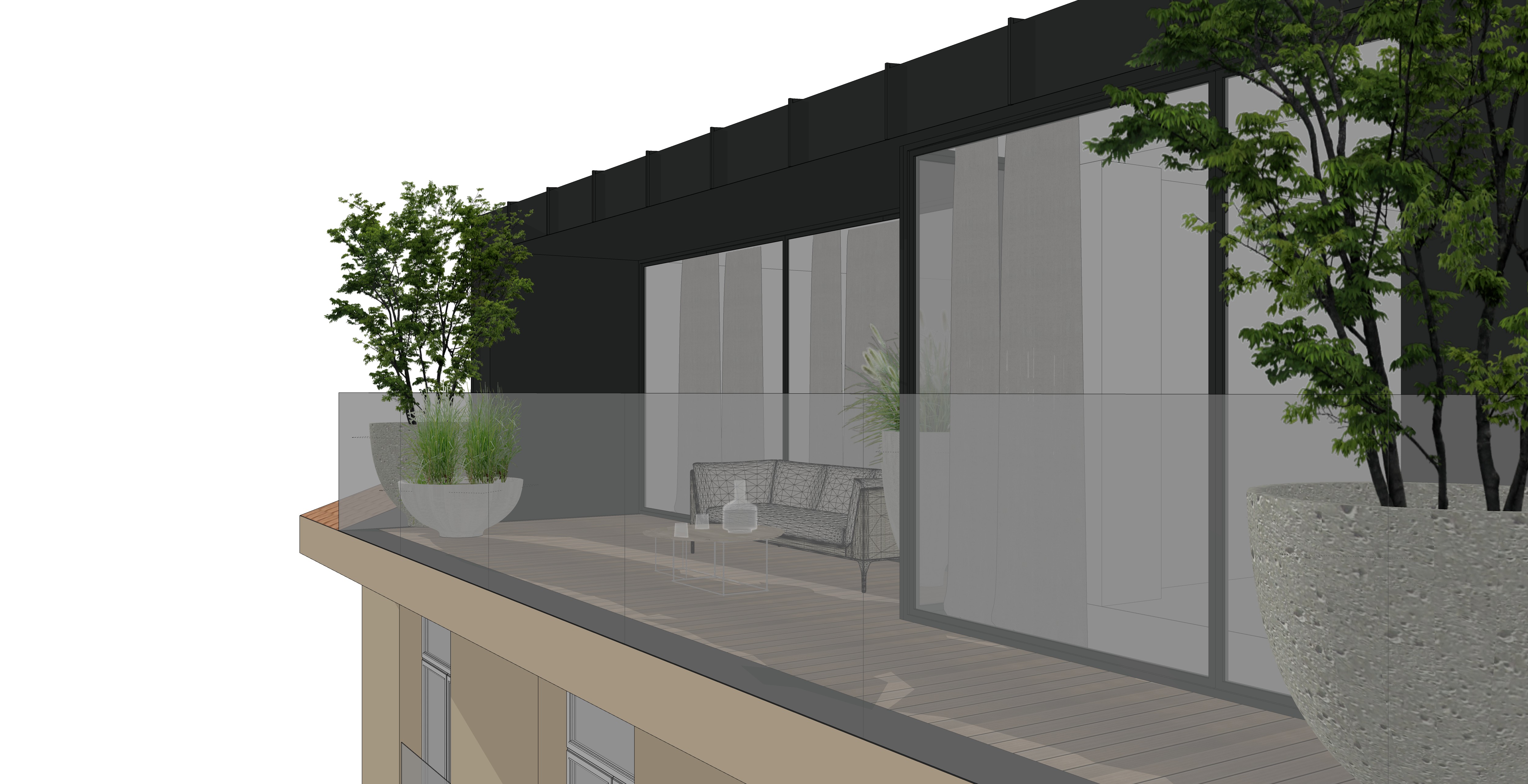 superstructure material black sheet metal reflections in the windows glass railing lots of greenery on the terrace